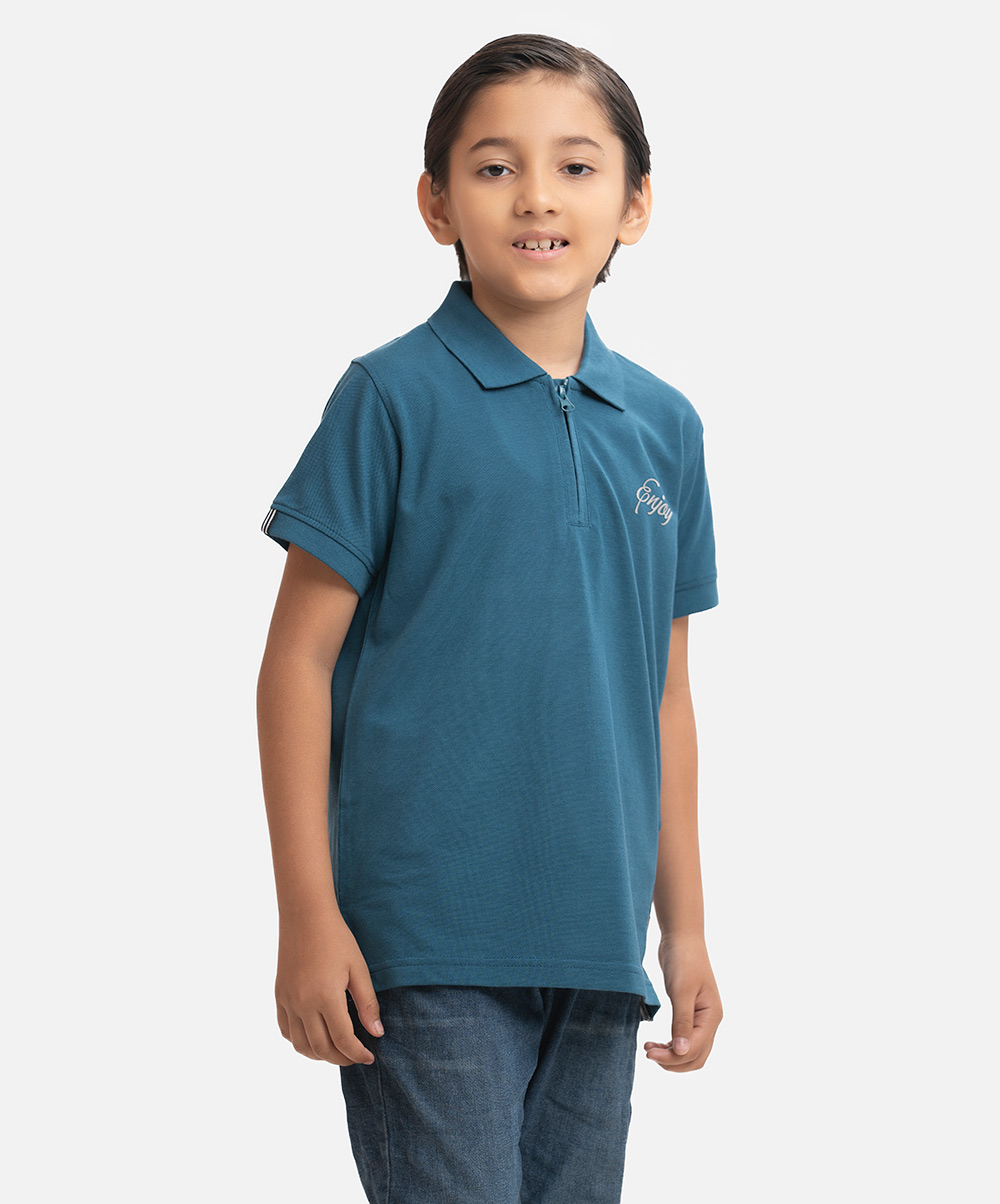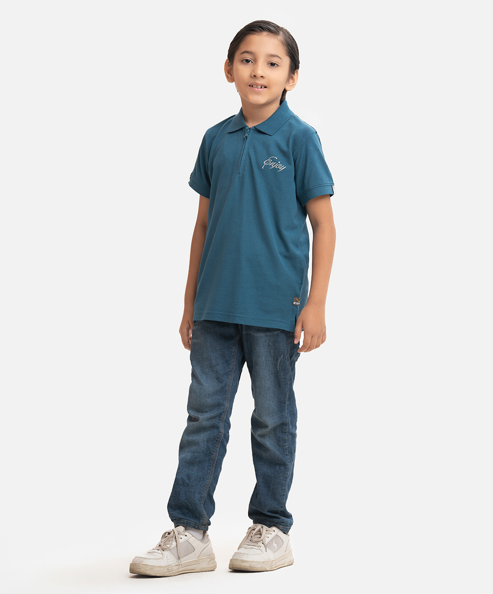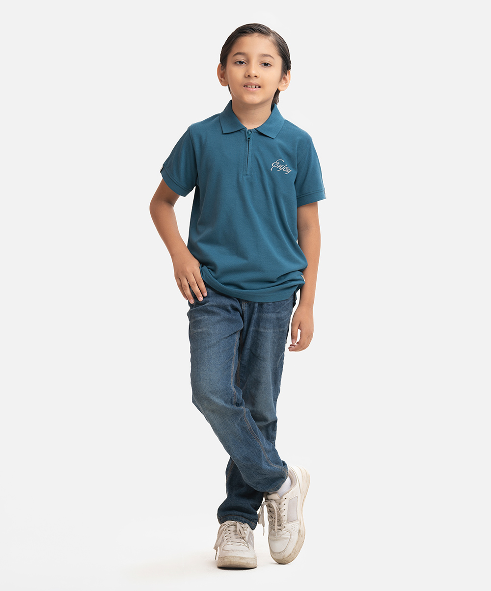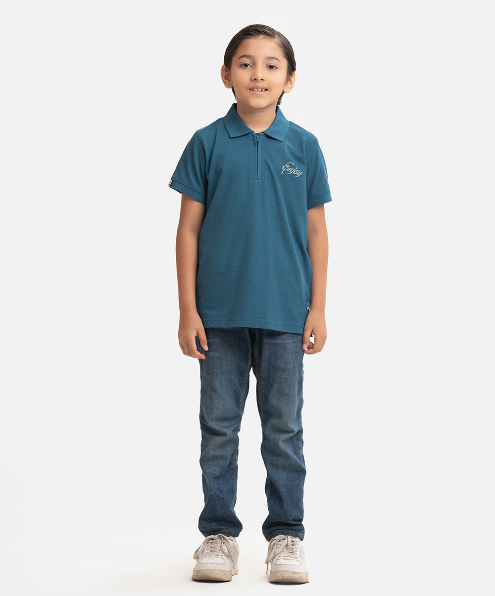 Kid boys Polo in cotton pique fabric. Classic collar, short sleeves and print at the front.