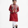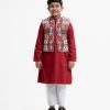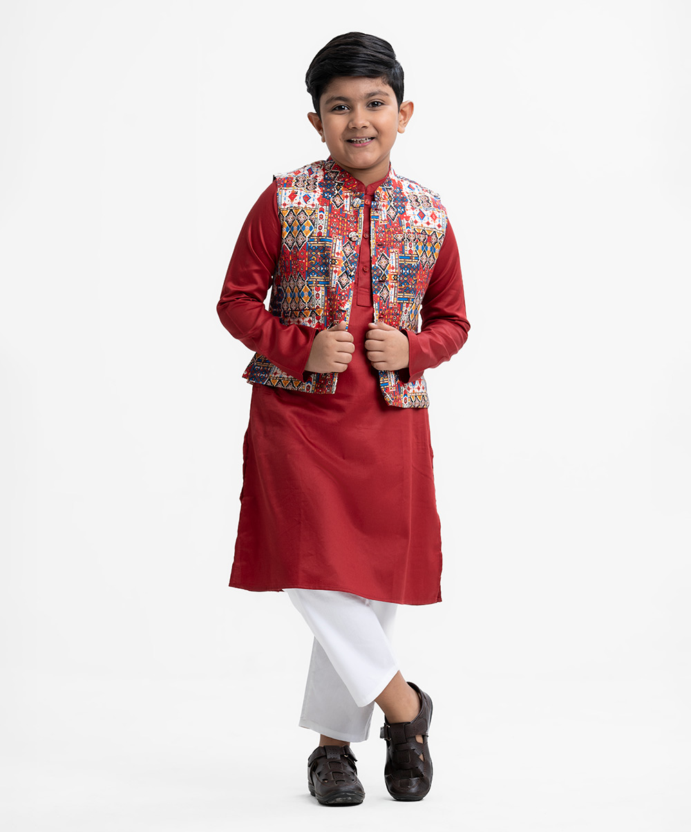Kid boys’ panjabi set in cotton fabric. Mandarin collar, inseam pockets and long sleeves panjabi. Paired with a cotton-blended waistcoat and cotton pant.