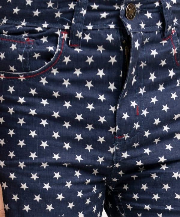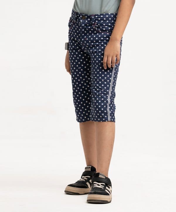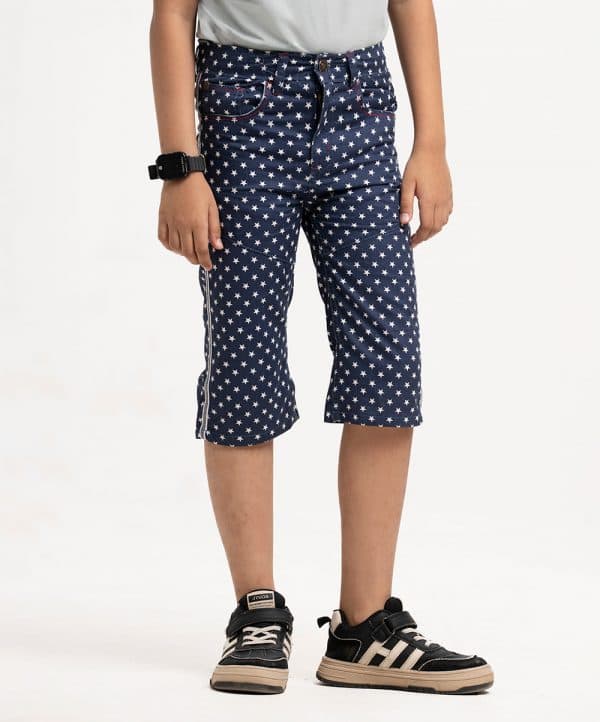 Kid boys’ printed three-quarter pant in twill fabric. Zipperfly and a button fastening at the front. Two side pockets and two patch pockets on the back.