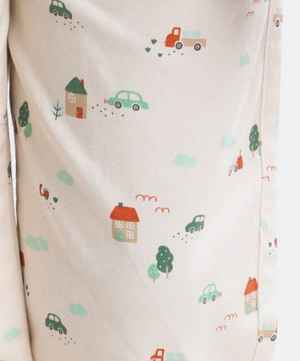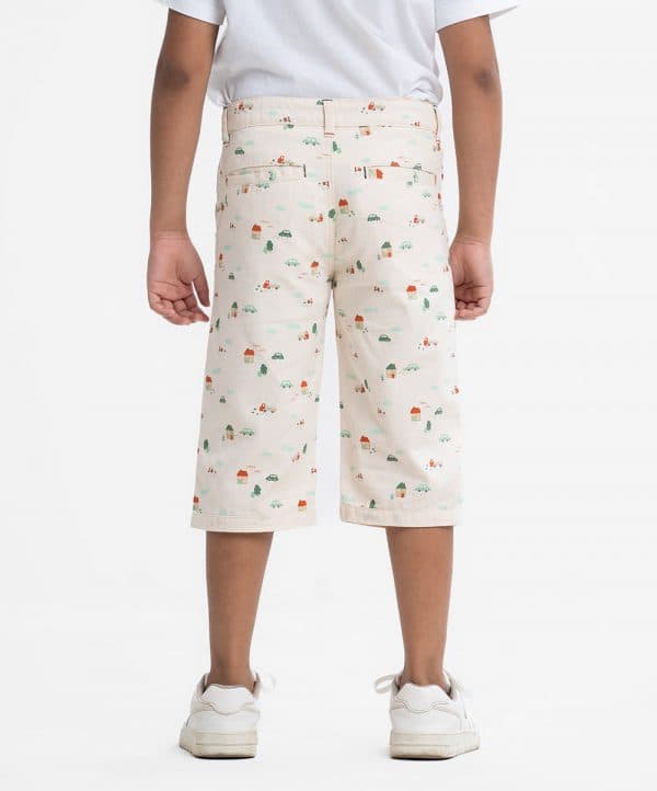 Kid boys’ printed three-quarter pant in twill fabric. Zipperfly and a button fastening at the front. Two side pockets and two patch pockets on the back.