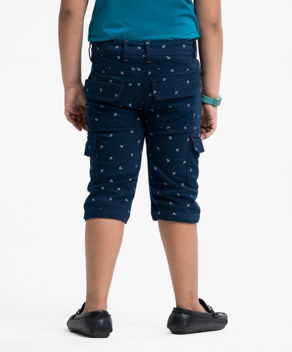 Kid boys’ printed three-quarter pants in twill fabric. Zipper fly and a button fastening at the front. Two side pockets and two patch pockets on the back.