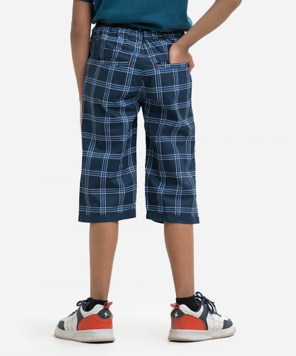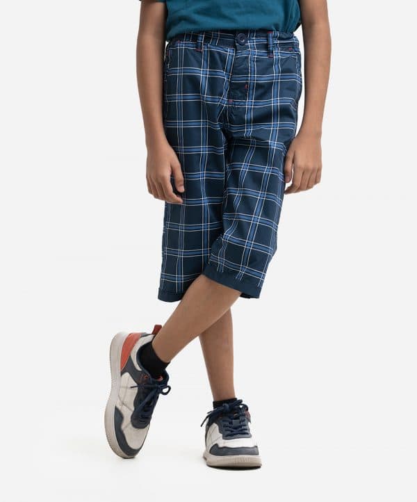 Kid boys’ printed three-quarter pants in cotton fabric. Zipper fly and a button fastening at the front. Two side pockets, one coin pocketand two back pockets.