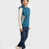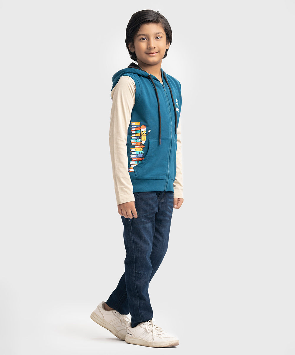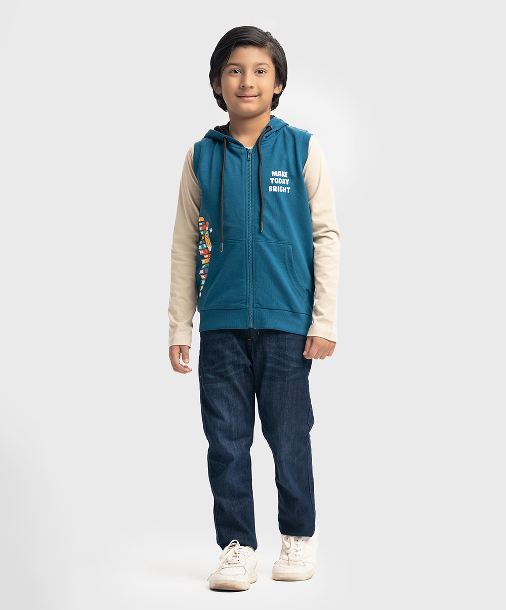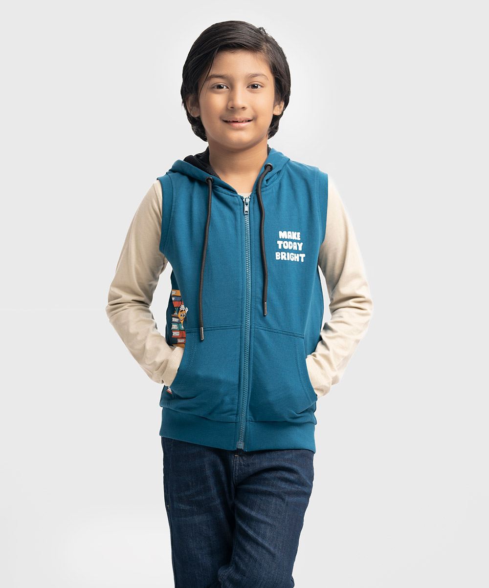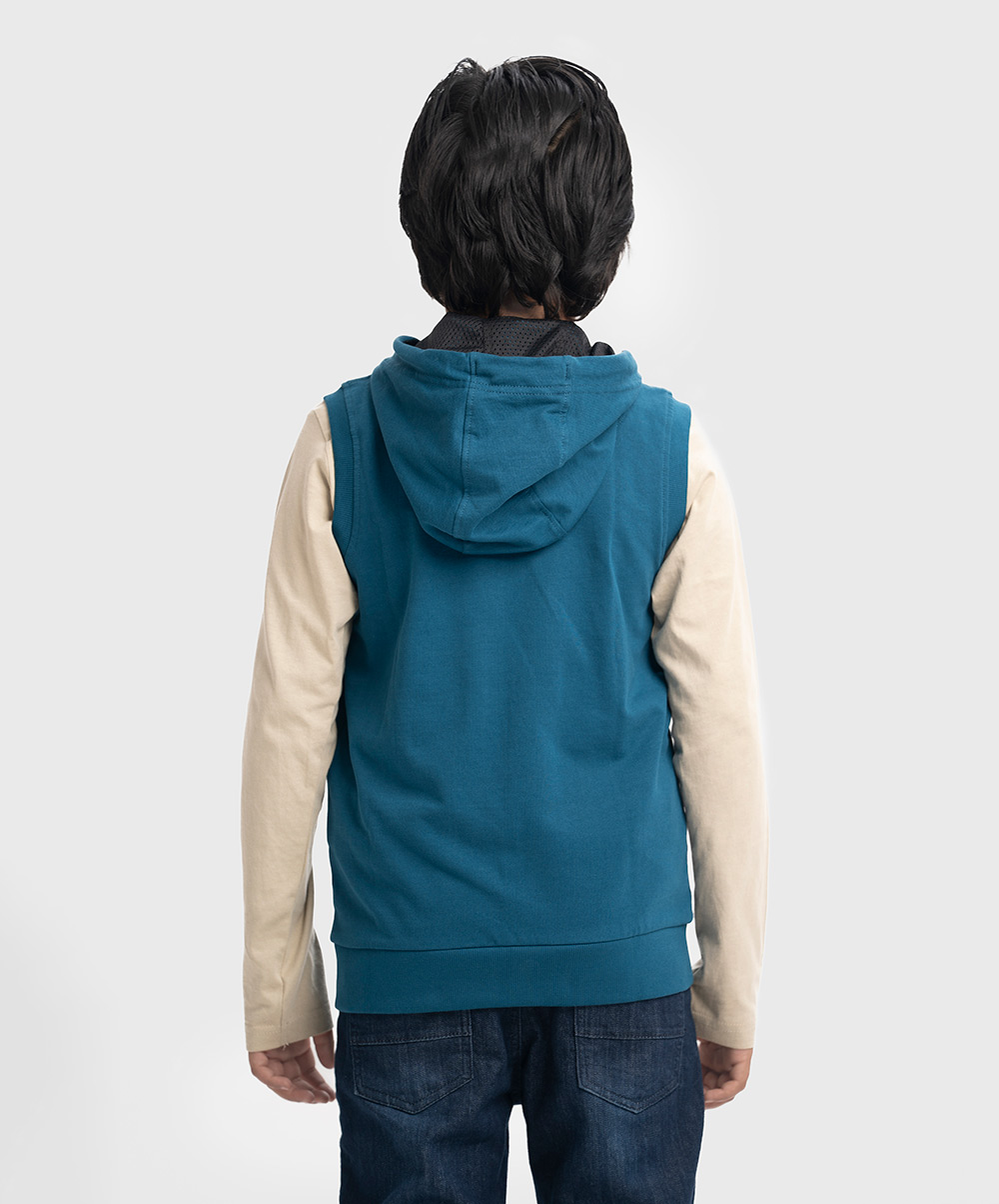 Sleeveless sweatshirt in French terry knit fabric. Hooded with an adjustable drawstring. Zipper closing with kangaroo pockets at the front.