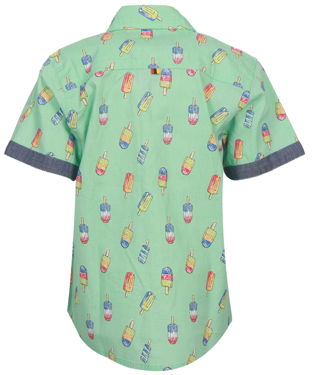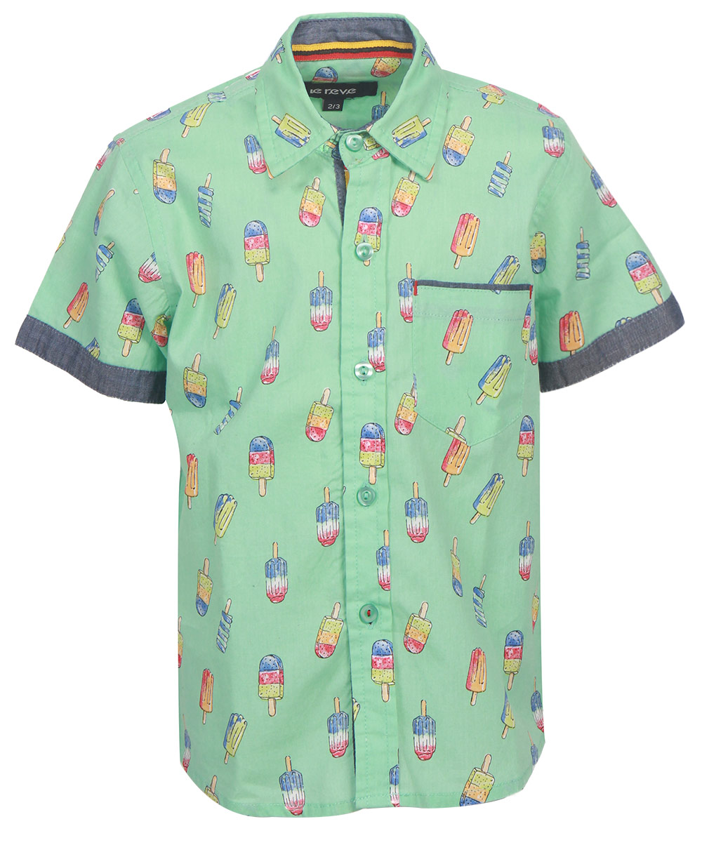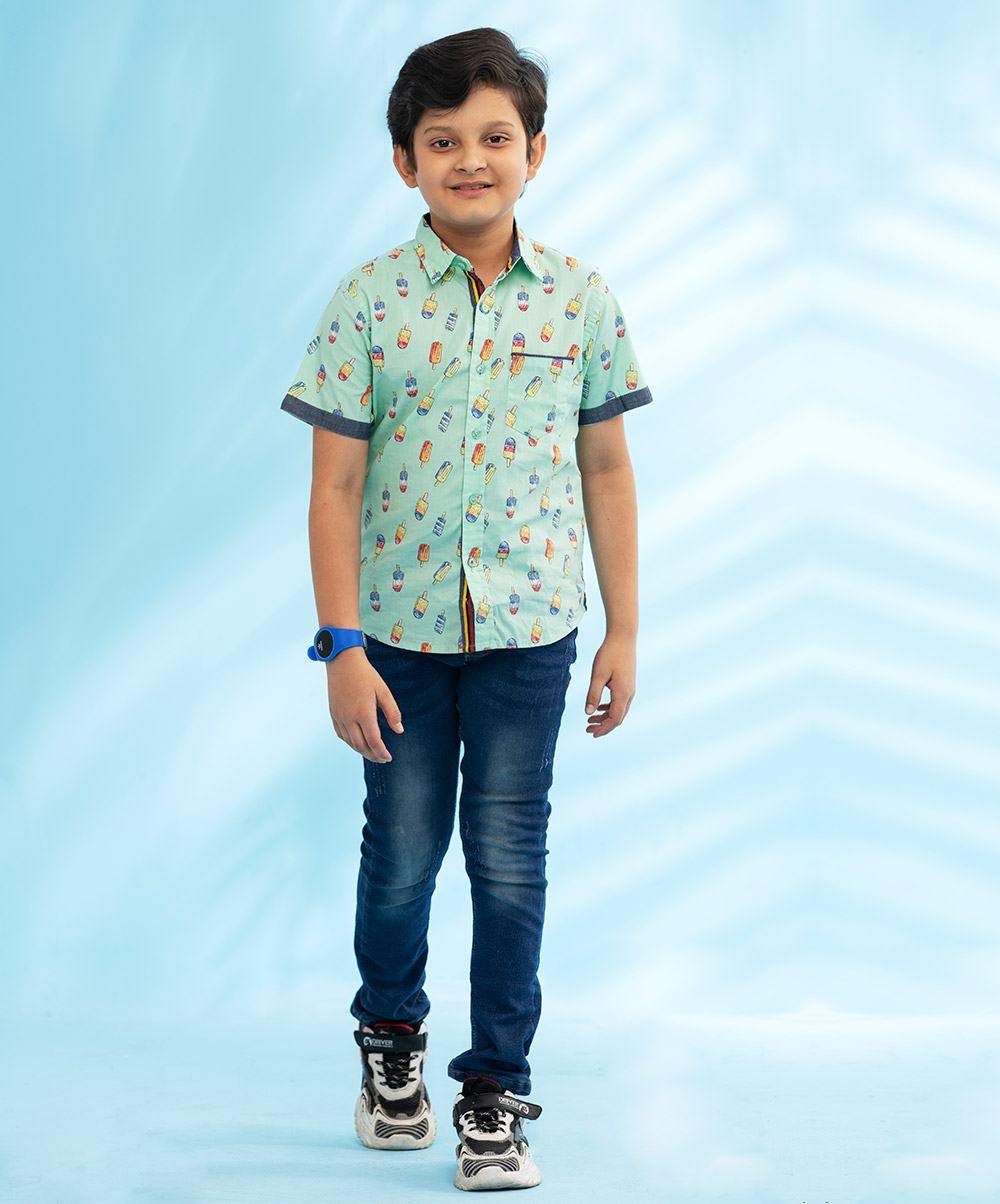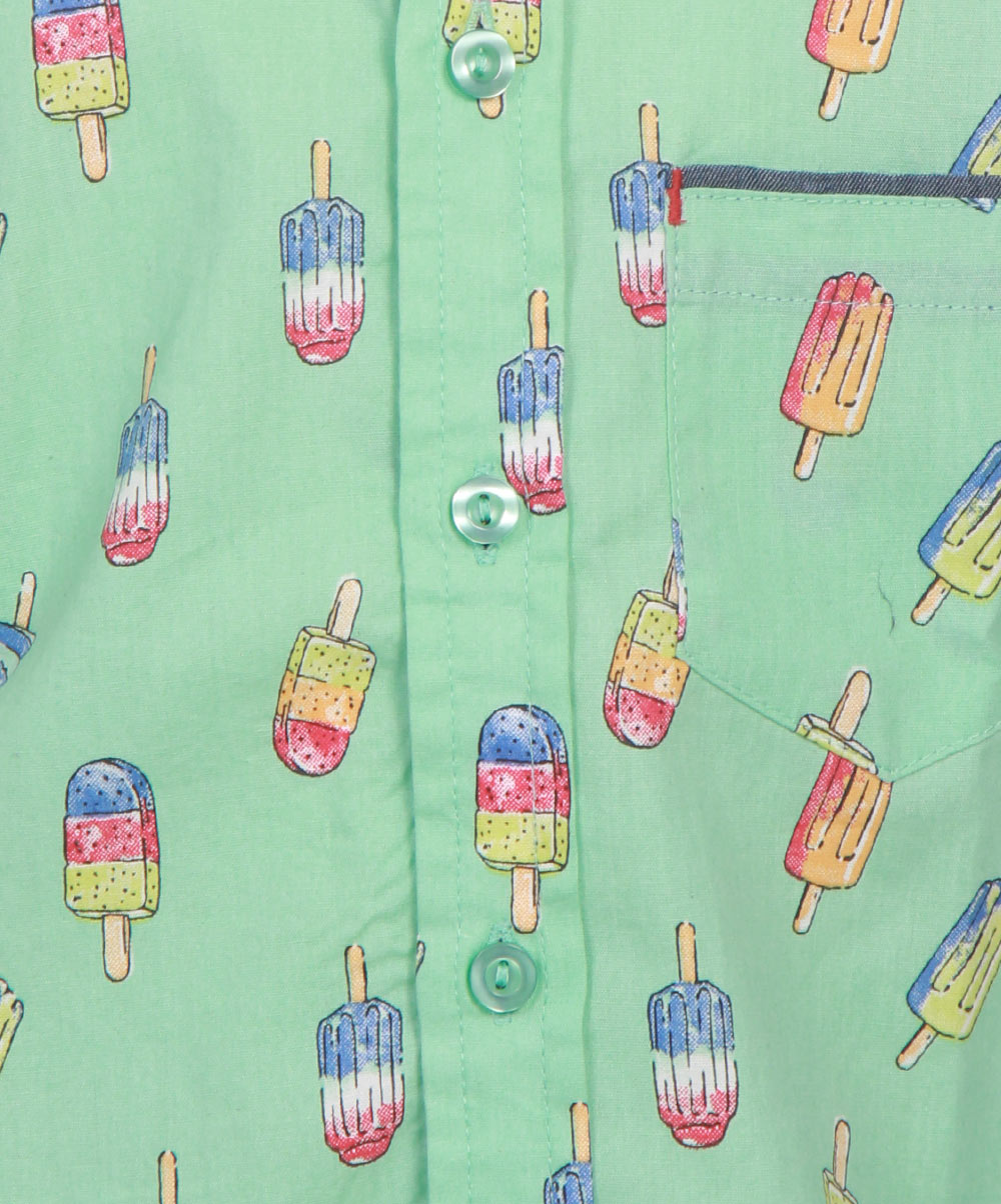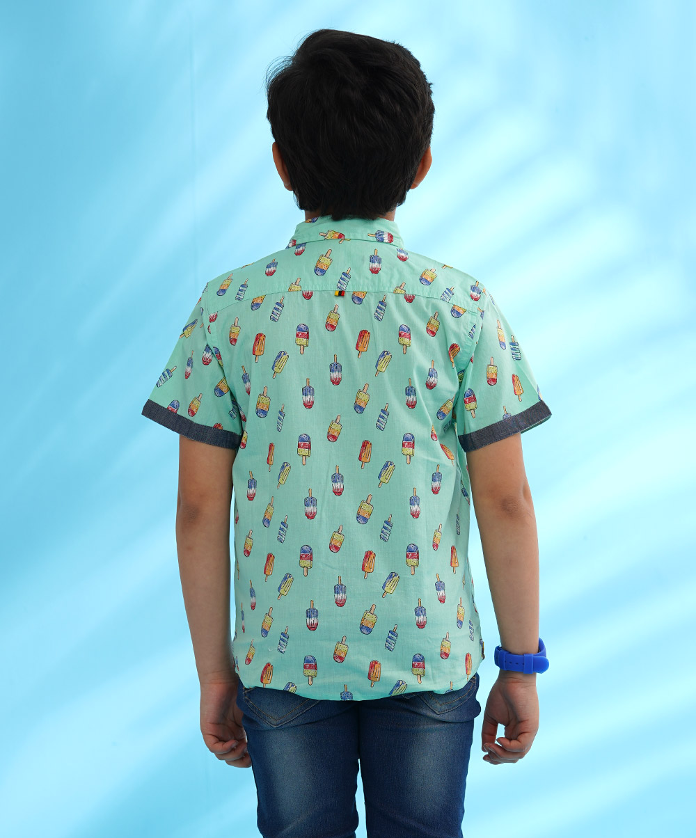 Light green casual shirt in cotton printed fabric, designed with contrast sleeves opening and inner button placket.