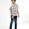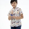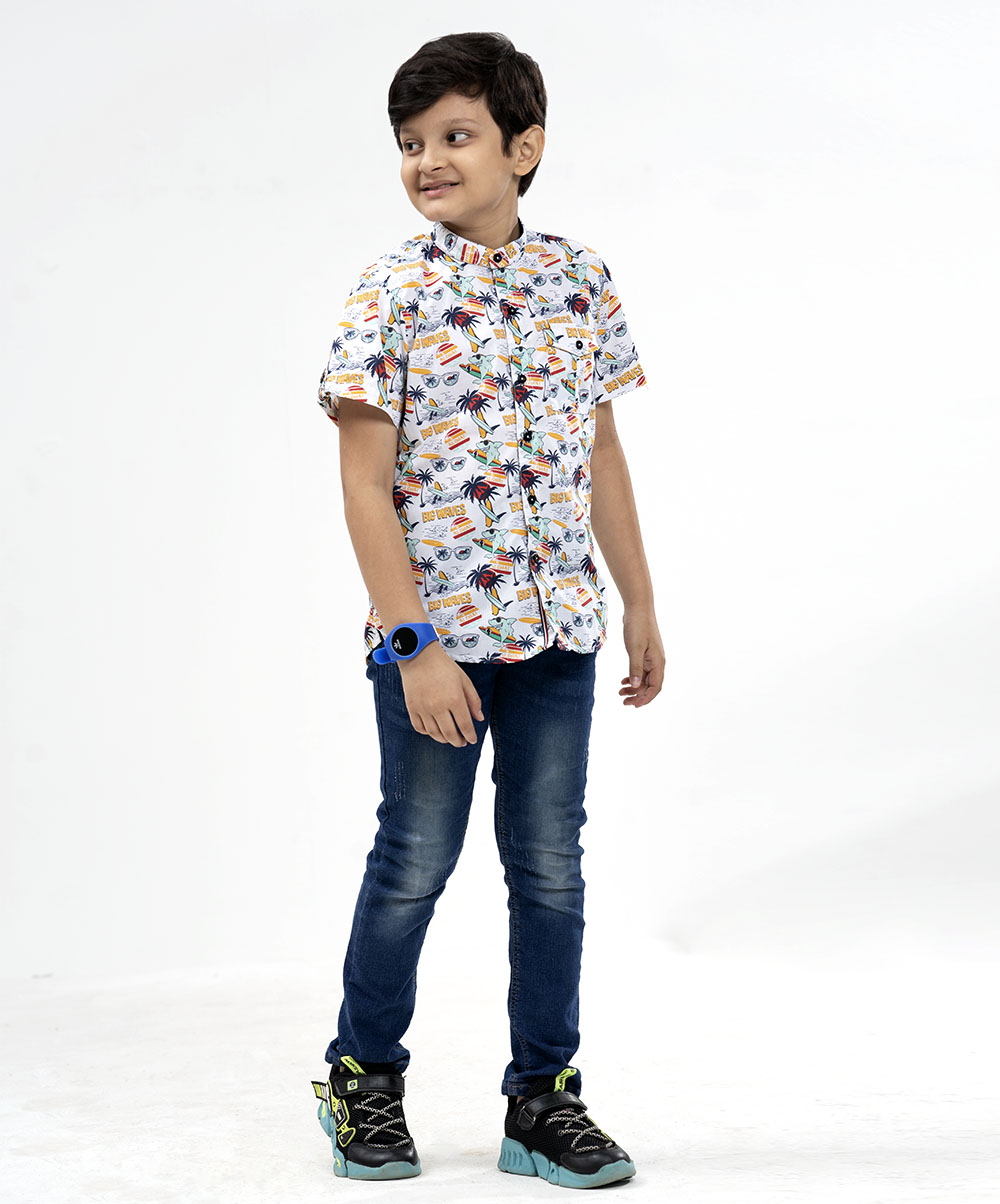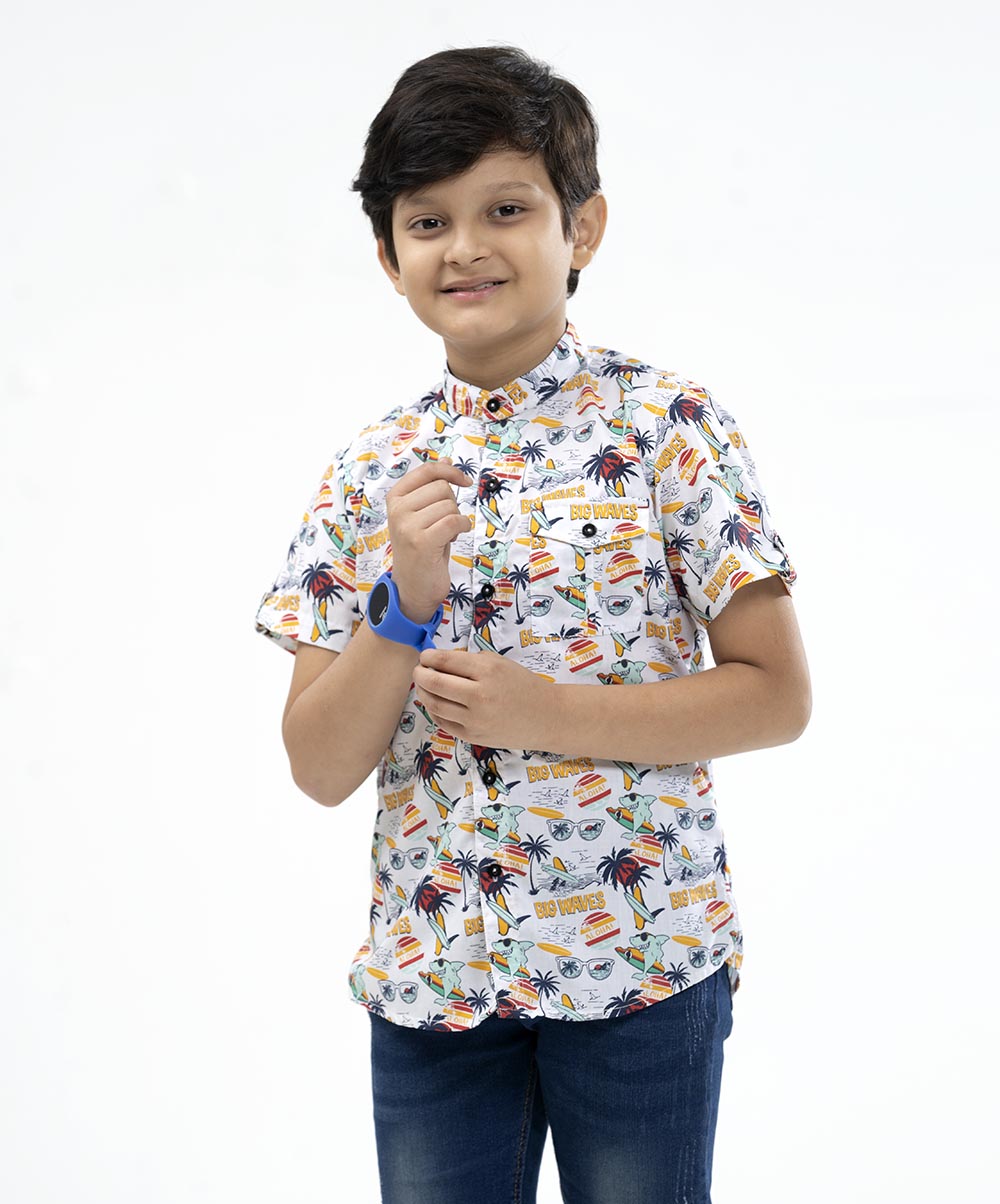 White casual shirt with band collar in printed cotton fabric. Comes in button tab sleeves and front pocket.