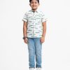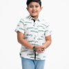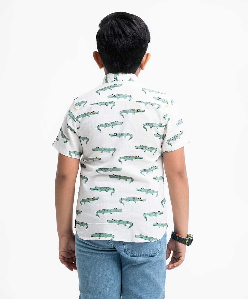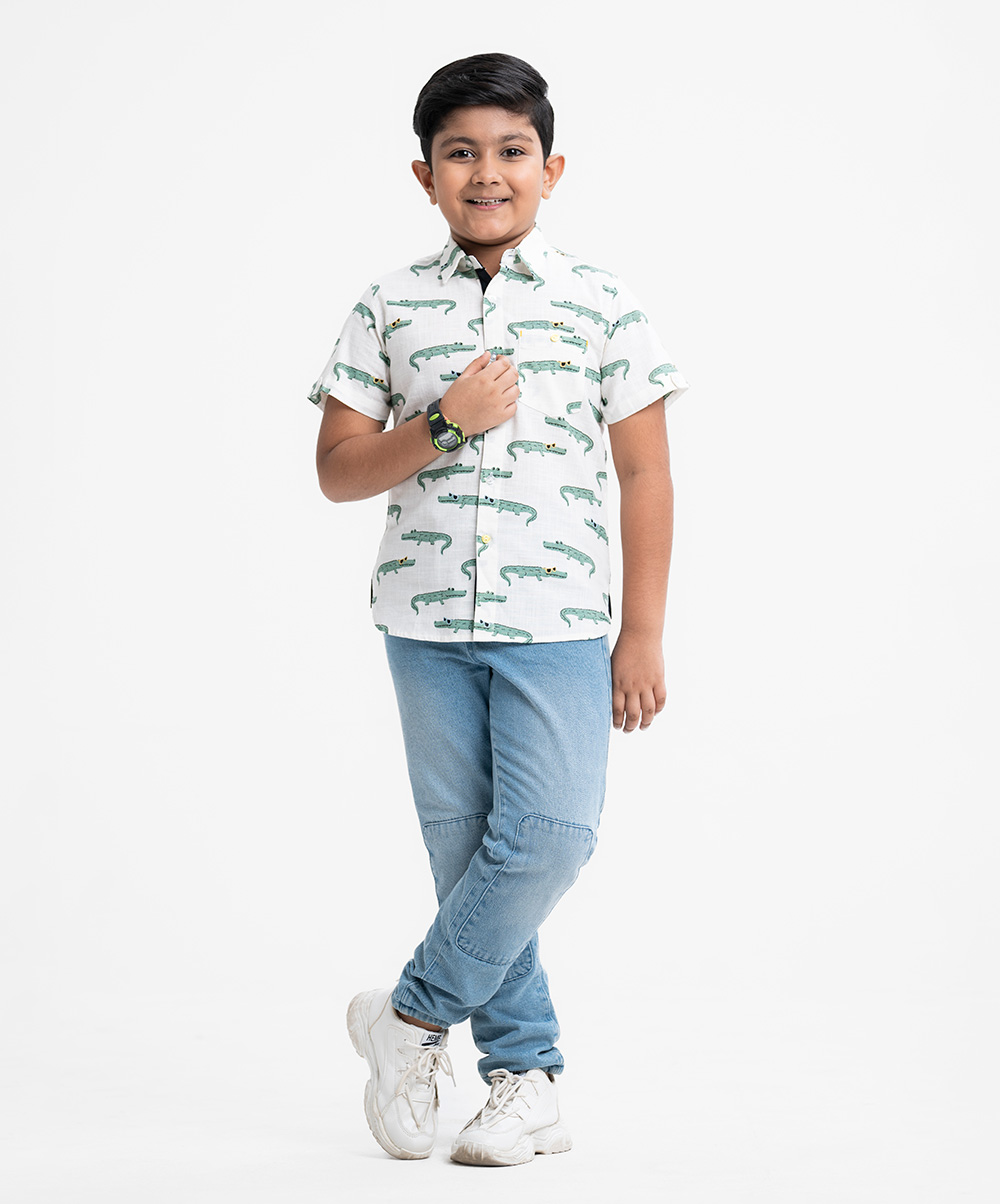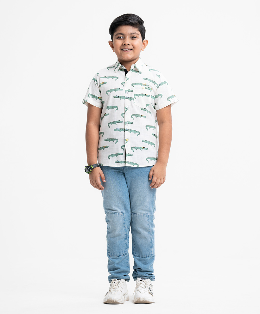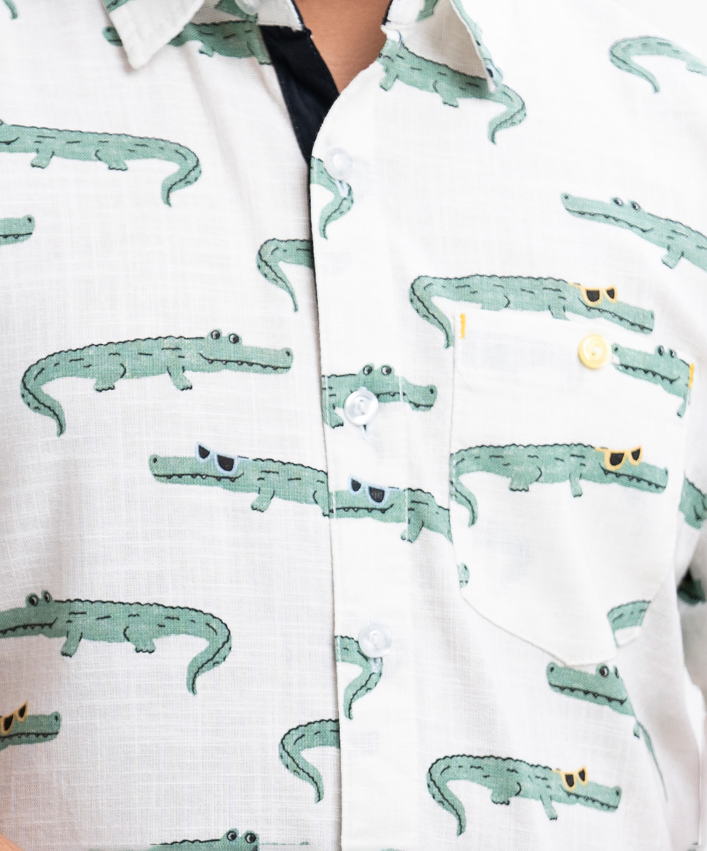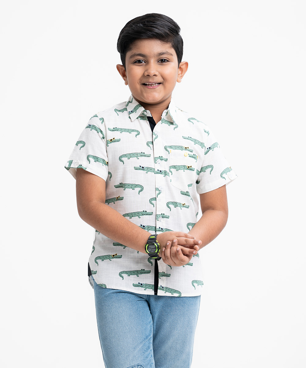 Kid boys short-sleeved casual shirt in crocodile-printed cotton fabric. Classic collar and a chest pocket.