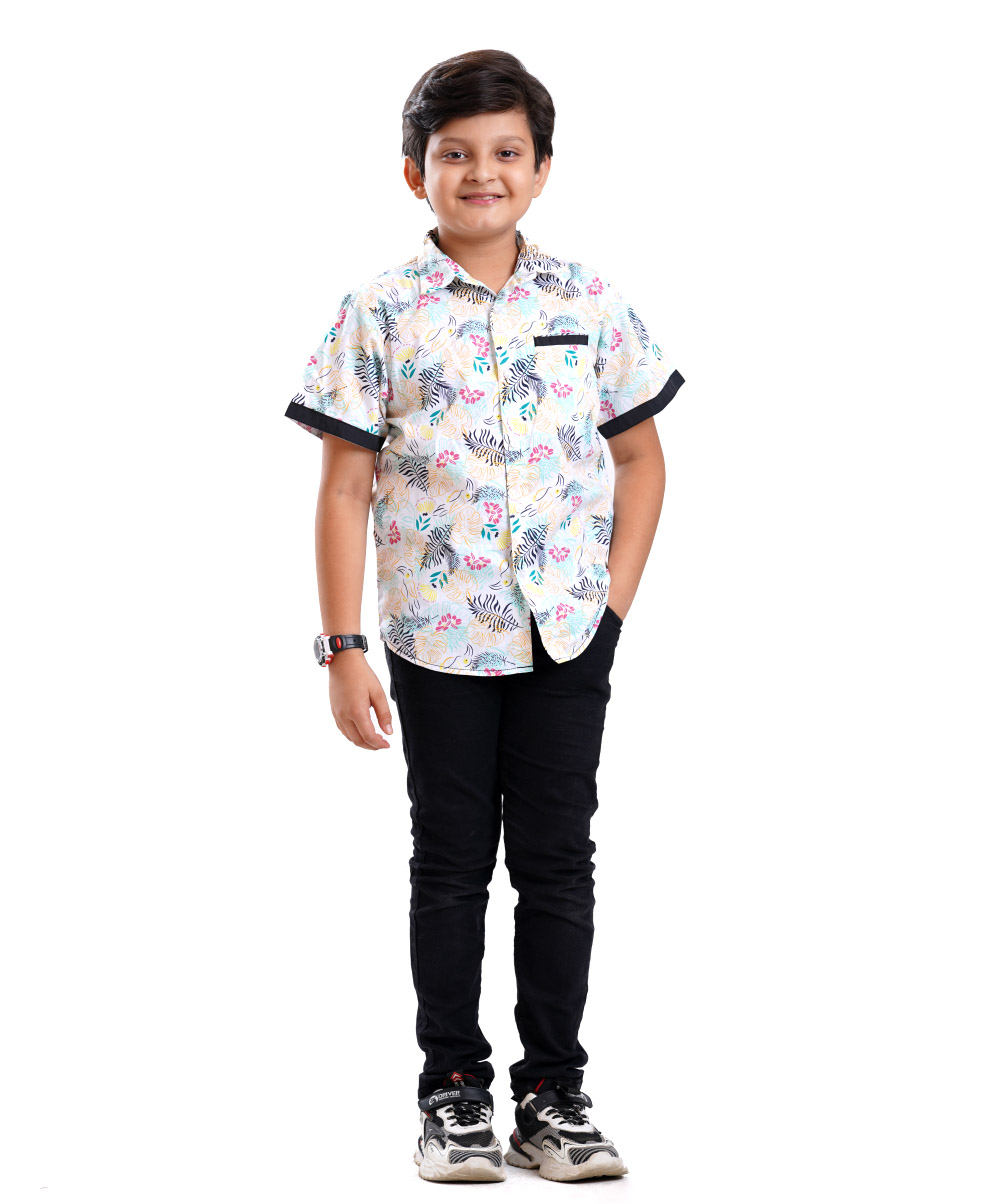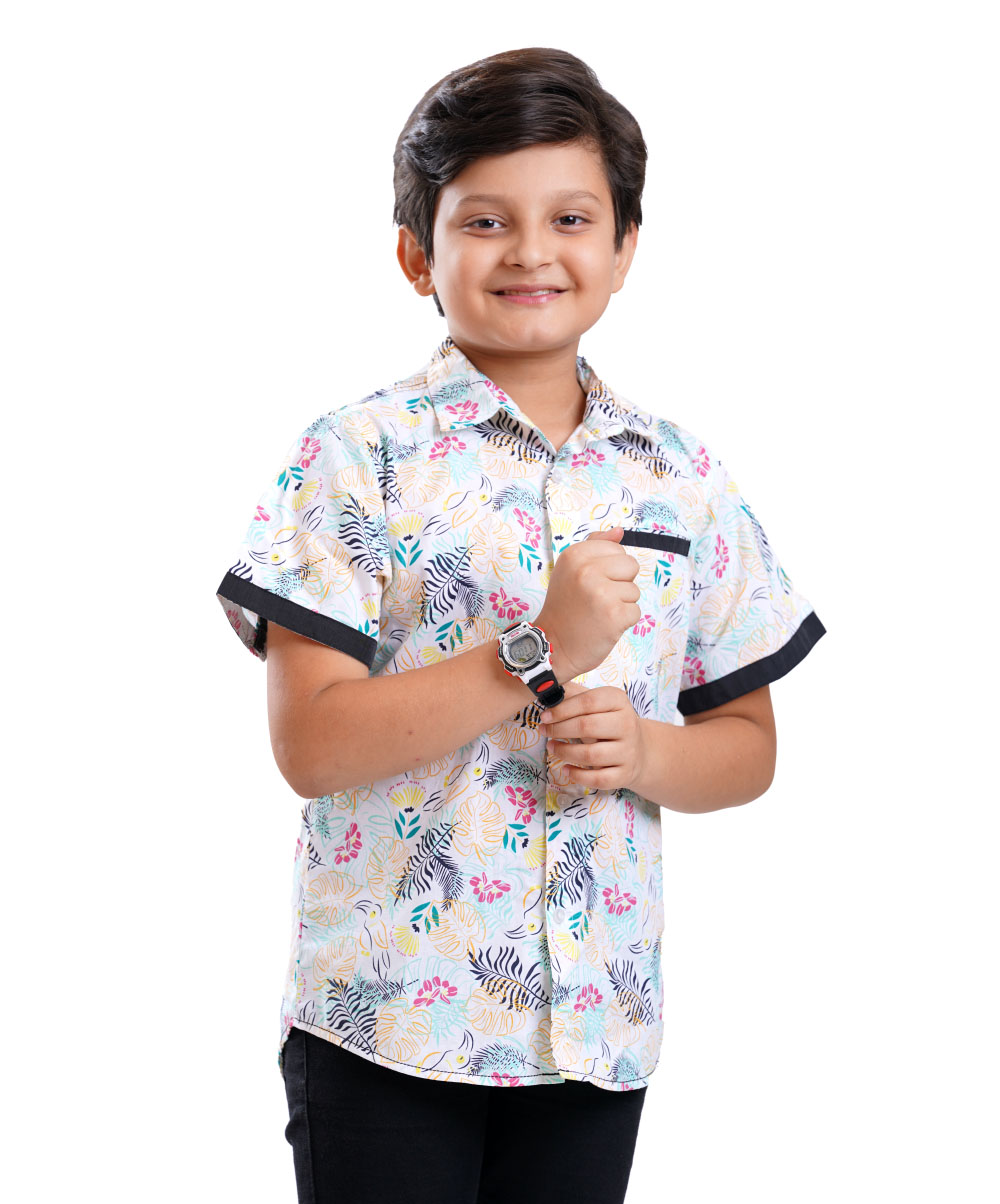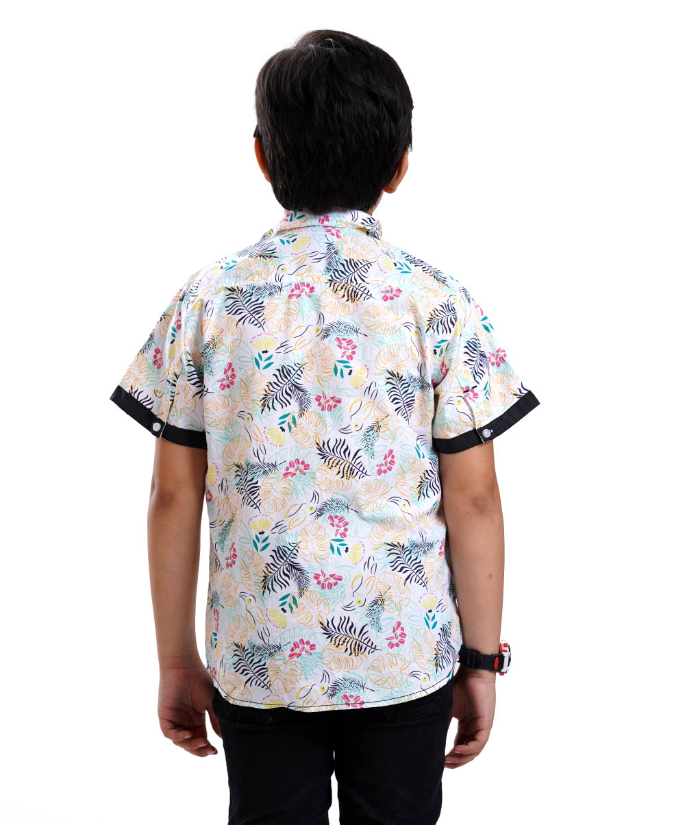 Summer vibe Print boy’s short sleeve cotton shirt with contrast detailing.