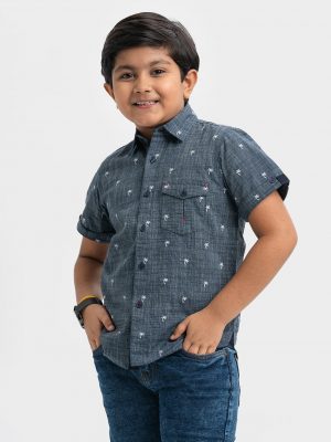 Kid boys short sleeves casual shirt in lemon printed cotton fabric. Classic collar and a chest pocket.