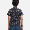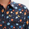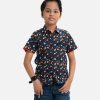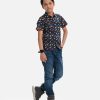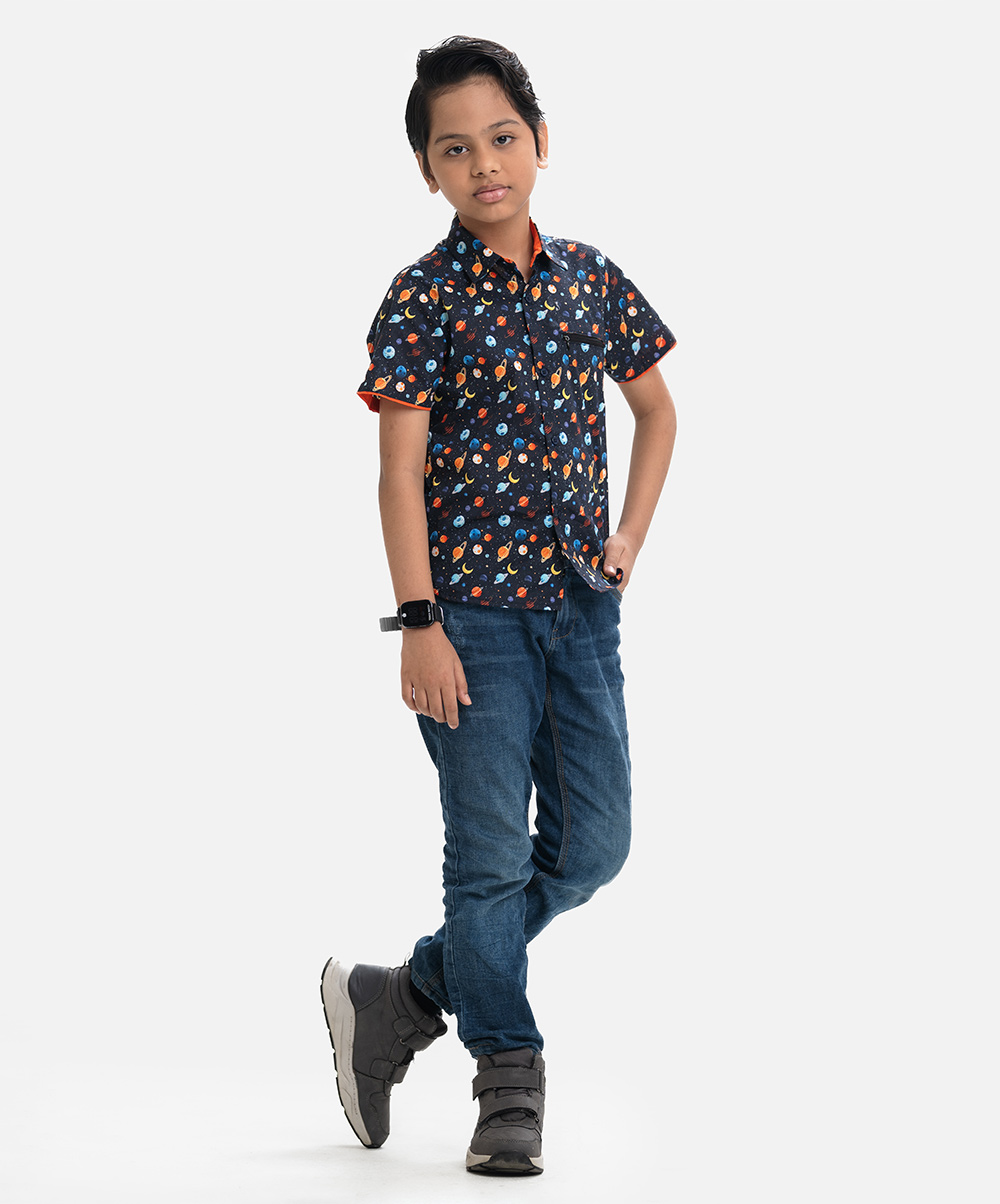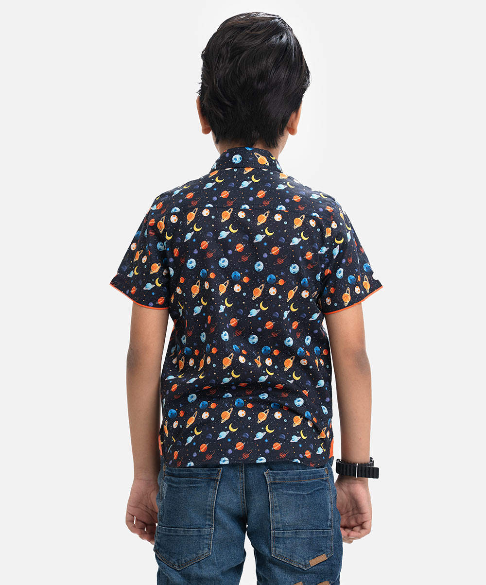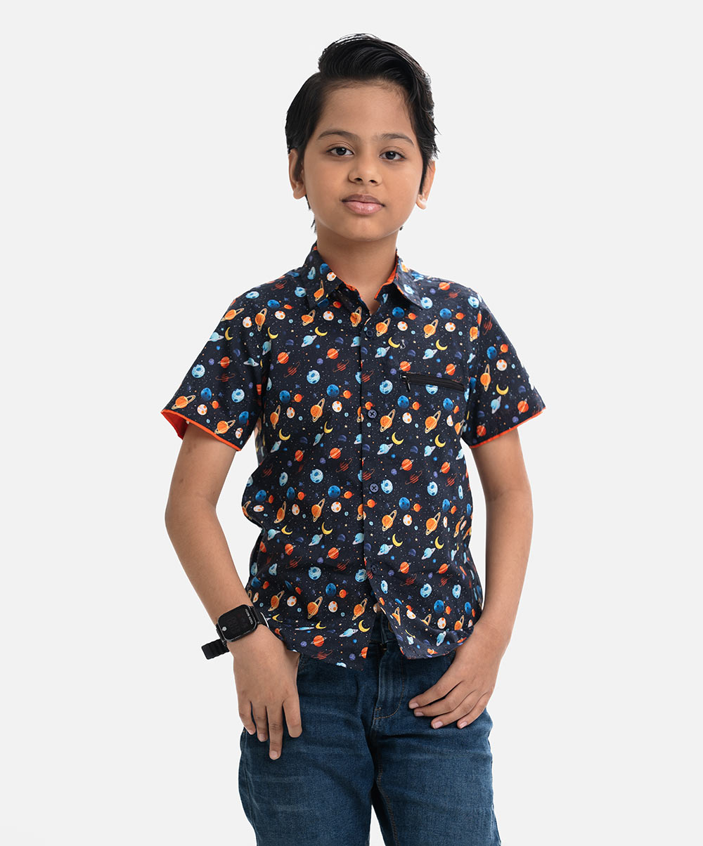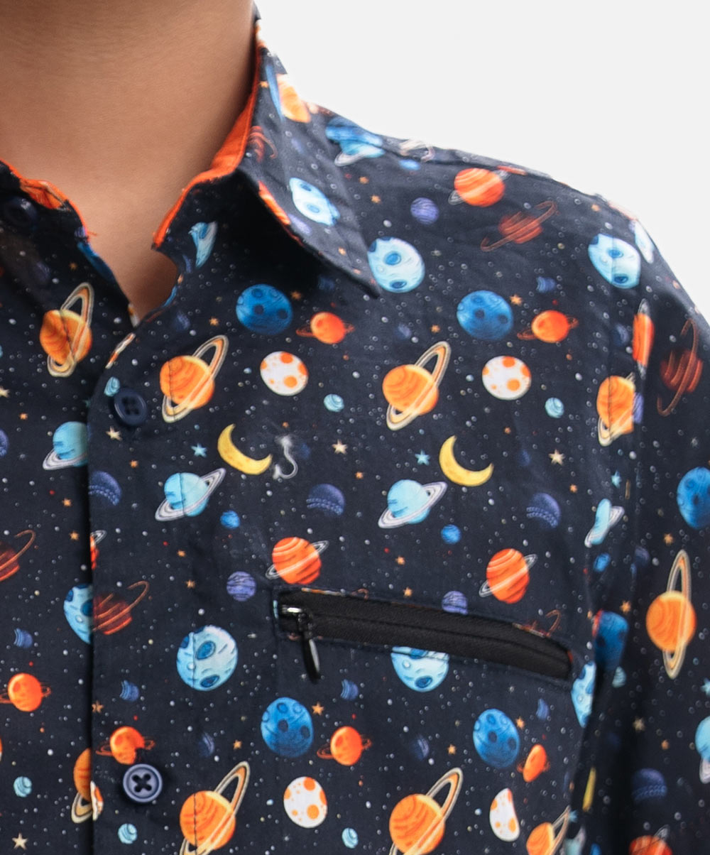 Short-sleeved cotton casual shirt with a classic collar and a zipper chest pocket.