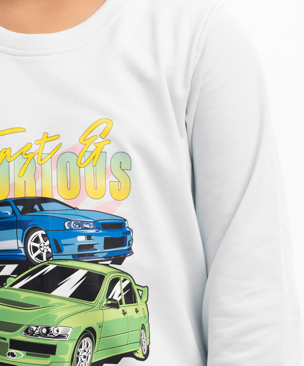 Round neck full-sleeved Sweatshirt in French terry knit fabric. Ribbed on the collar and cuffs, printed on the chest.