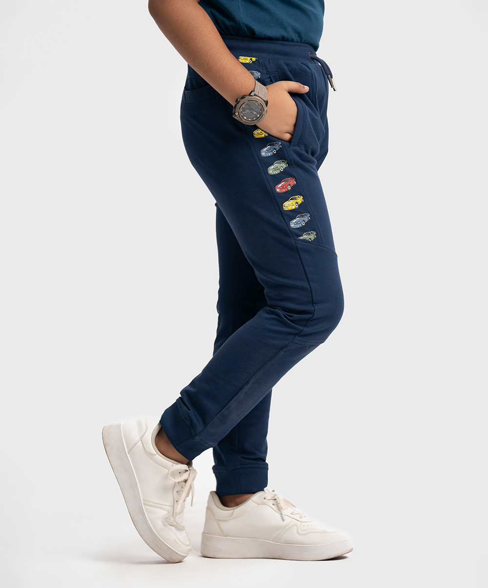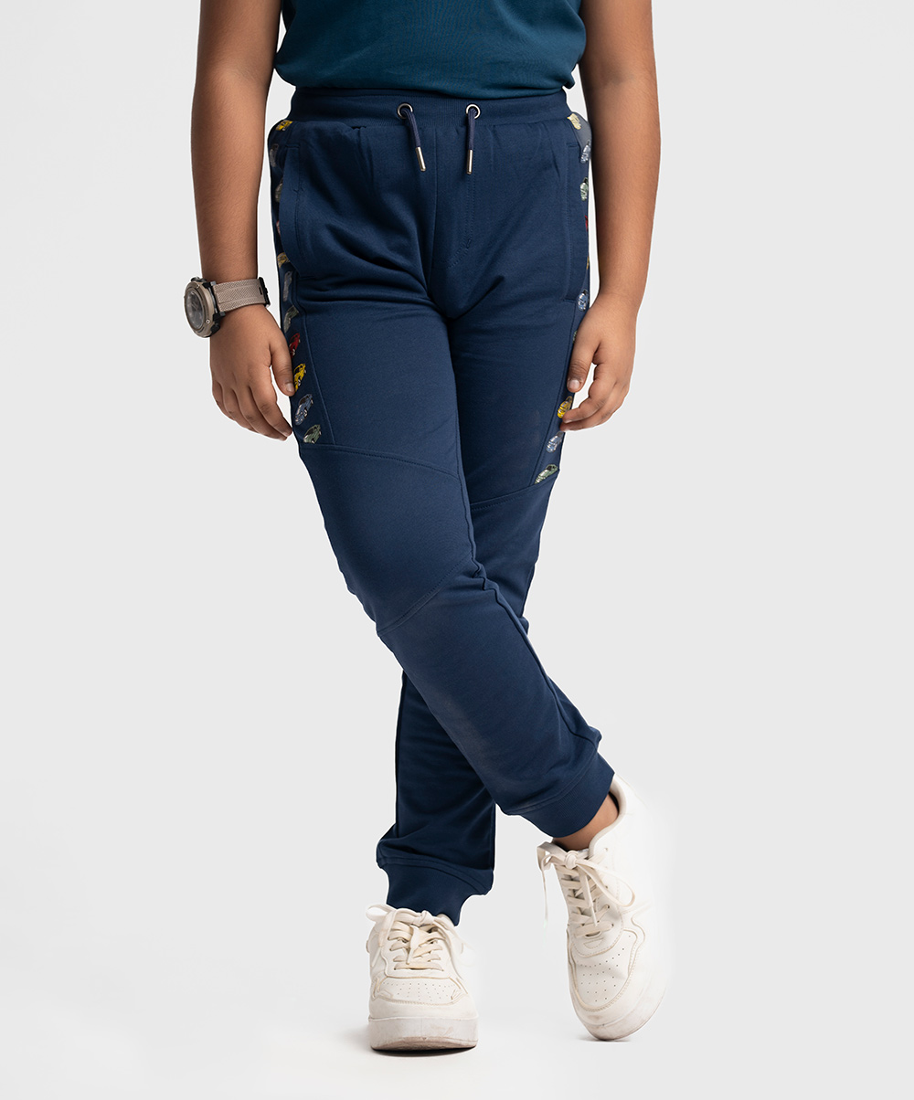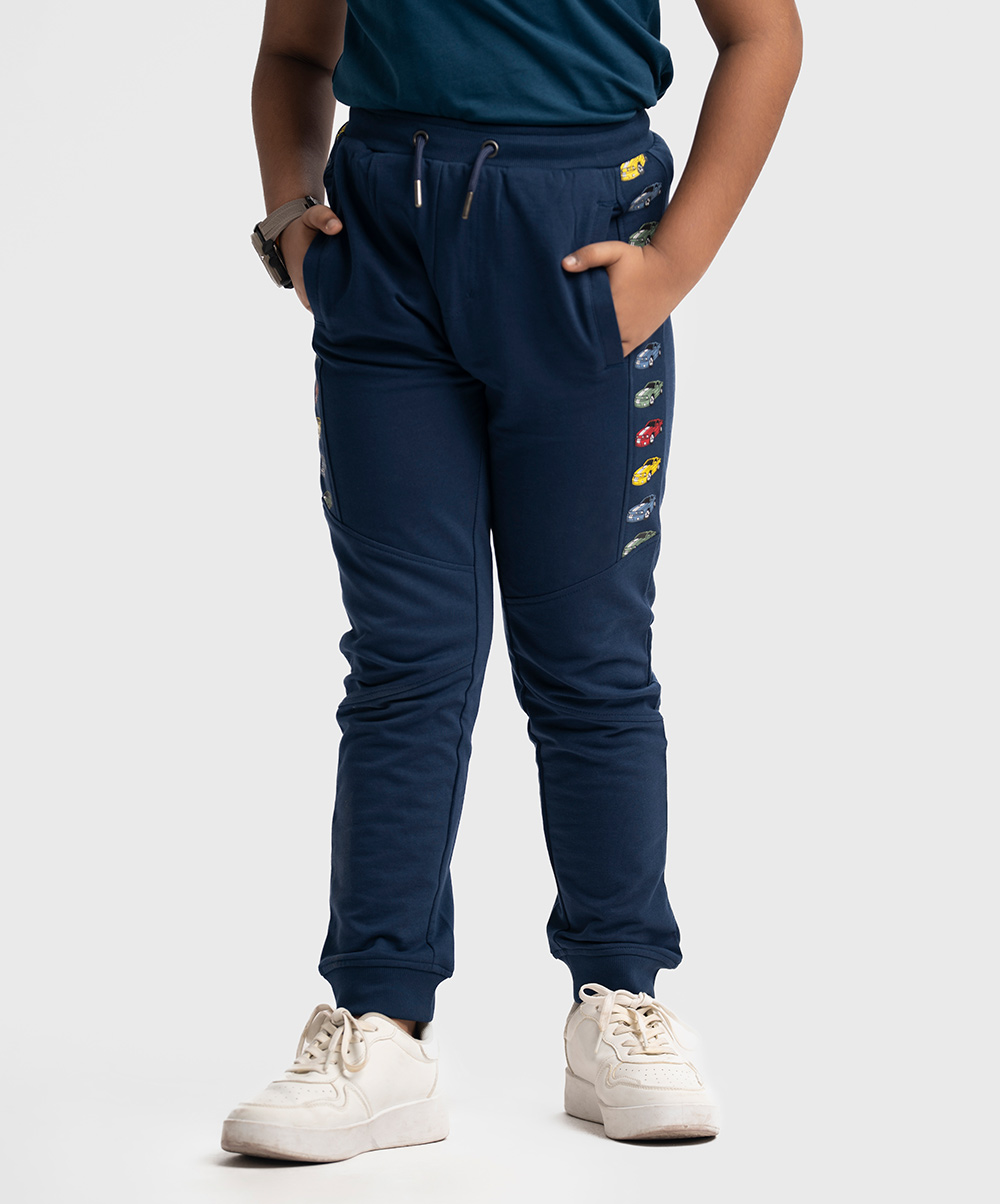 Kid boys sweatpants in French terry fabric. Elasticized, drawstring waistband, welt side pockets, and side car printed.