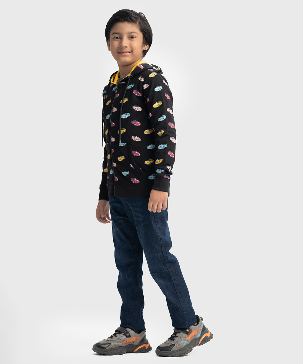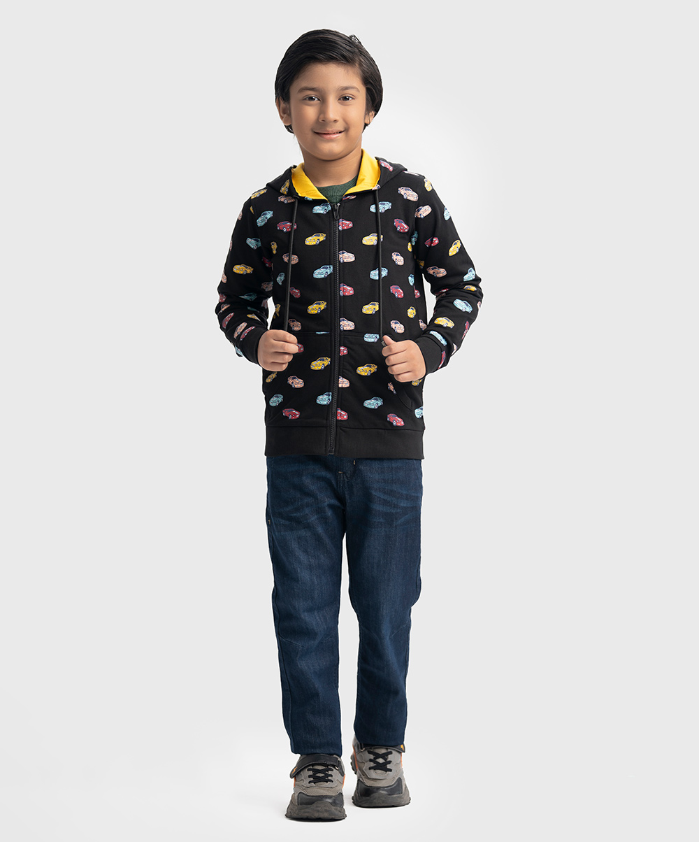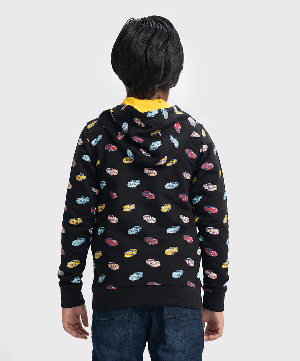 Attached hoodie sweatshirtin cotton french terry fabric. Zipper closed, kangaroo pocket at the front.