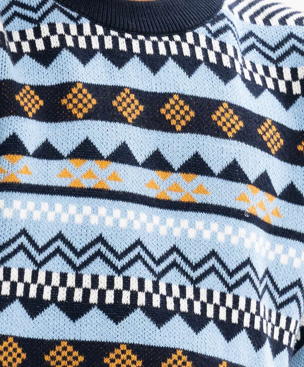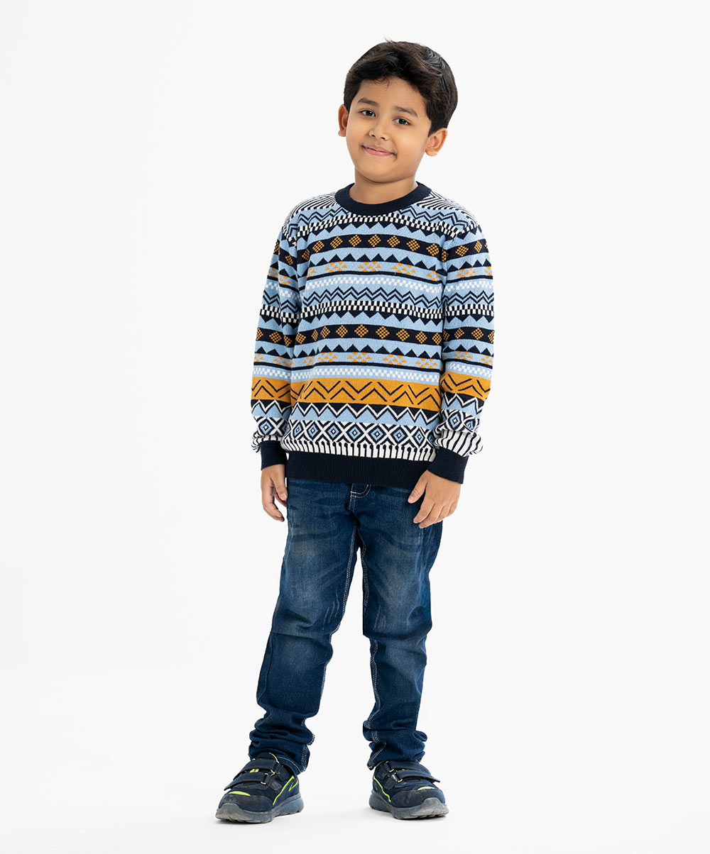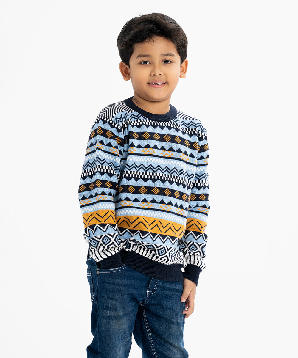Kid boy's geometric printed sweater in blended cotton knit fabric. Round collar, full sleeves and a straight hem. Featuring narrow ribbing at the collar, cuffs, and hem.