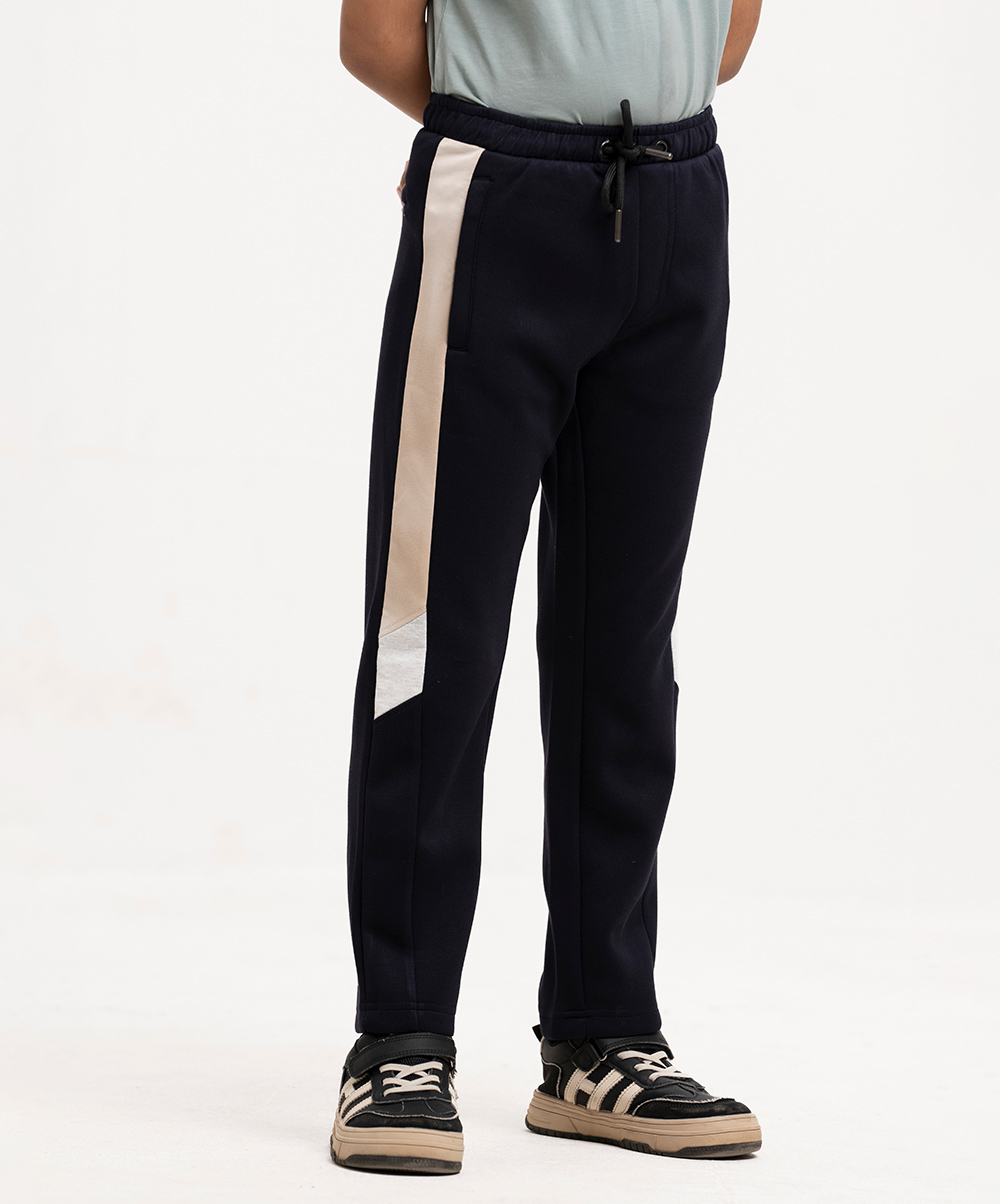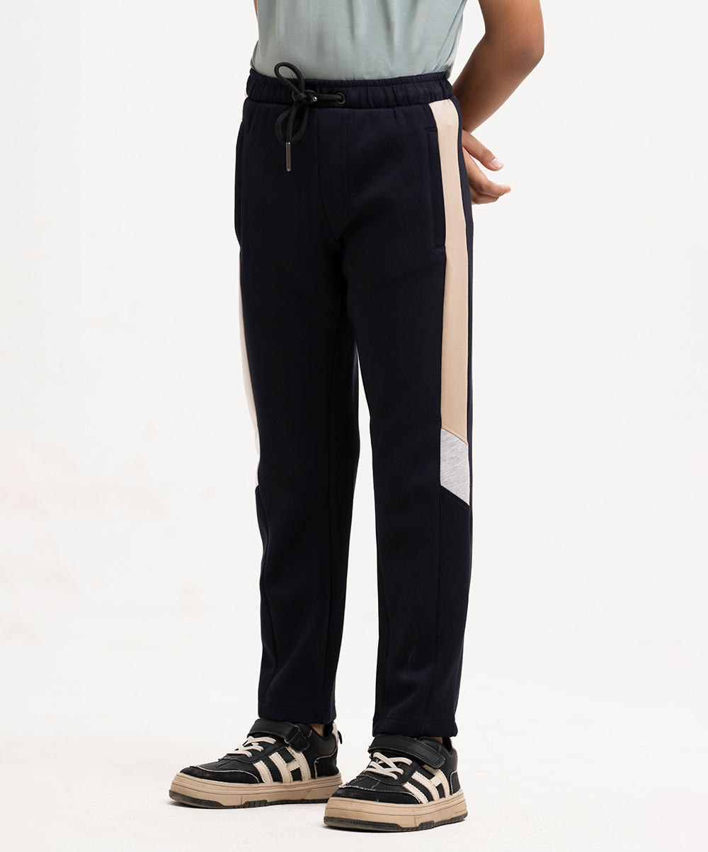Kids boys track pant in interlock fabric. Concealed elasticated waistline with drawstring cord. Two side pockets with high lighter and a back pocket.