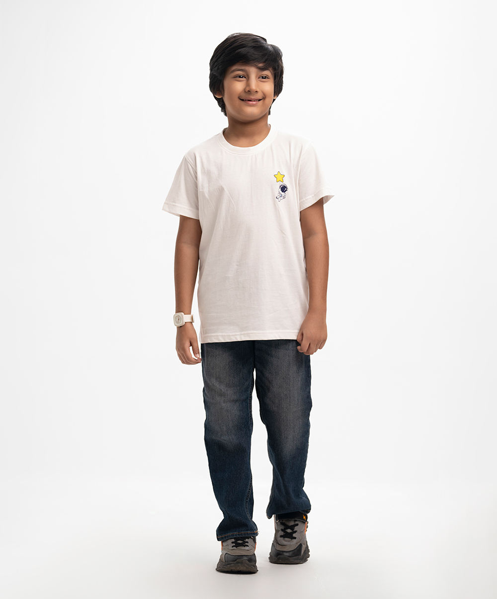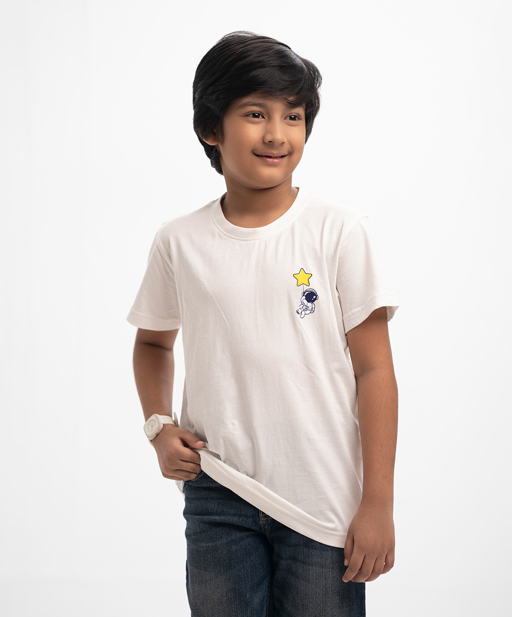 Kid boys t-shirt in cotton single jersey fabric. Round neck, short sleeves. Print detail at the front.