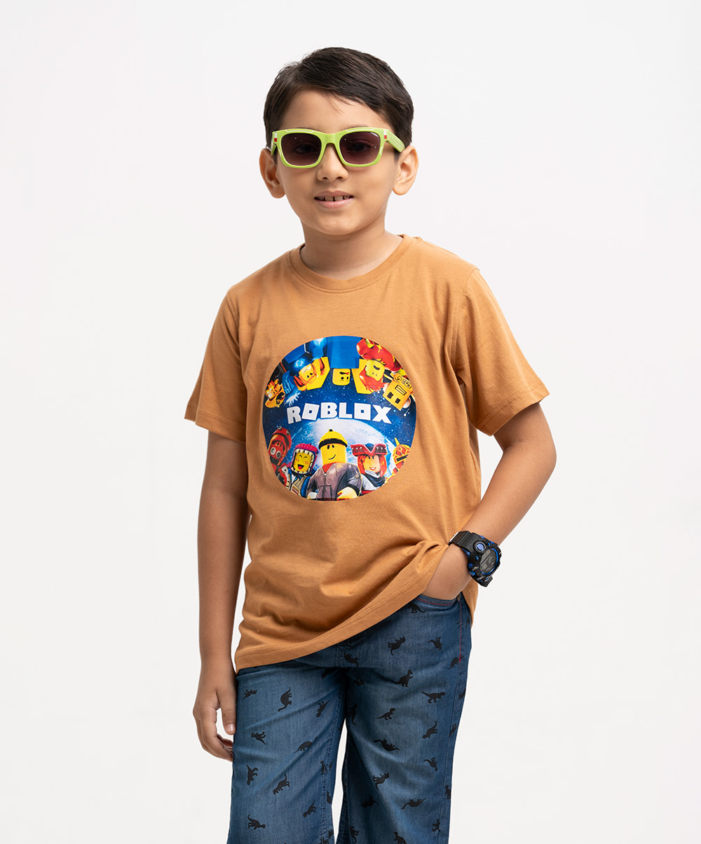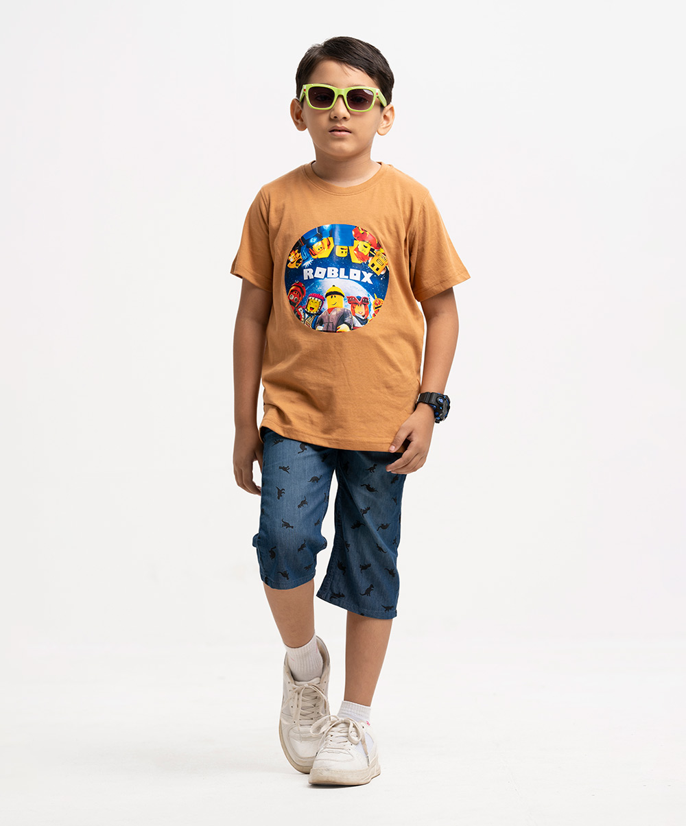 Kid boy’s round neck t-shirt in cotton single jersey knit fabric. Short sleeves and a chest pocket with print.