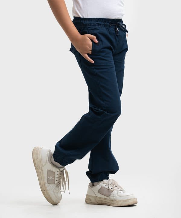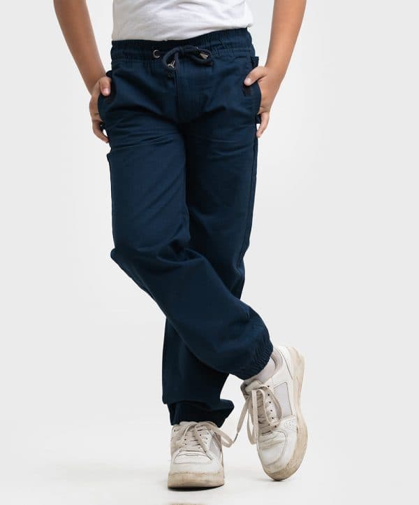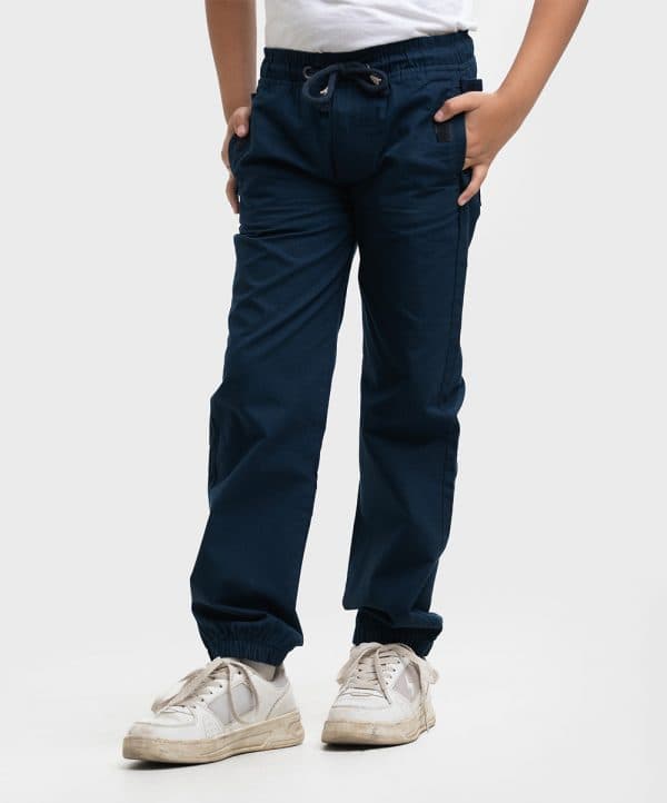 Kid boys long woven pants in cotton-blended fabric. Two front side pockets and two back flap pockets. Concealed elasticated waistband cord.