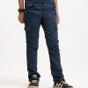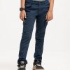 Kid boys’ long woven pant in twill fabric. Features two front pockets, two side cargo-style mobile pockets, a zip fly with a metal button, and two back pockets.