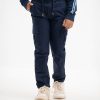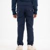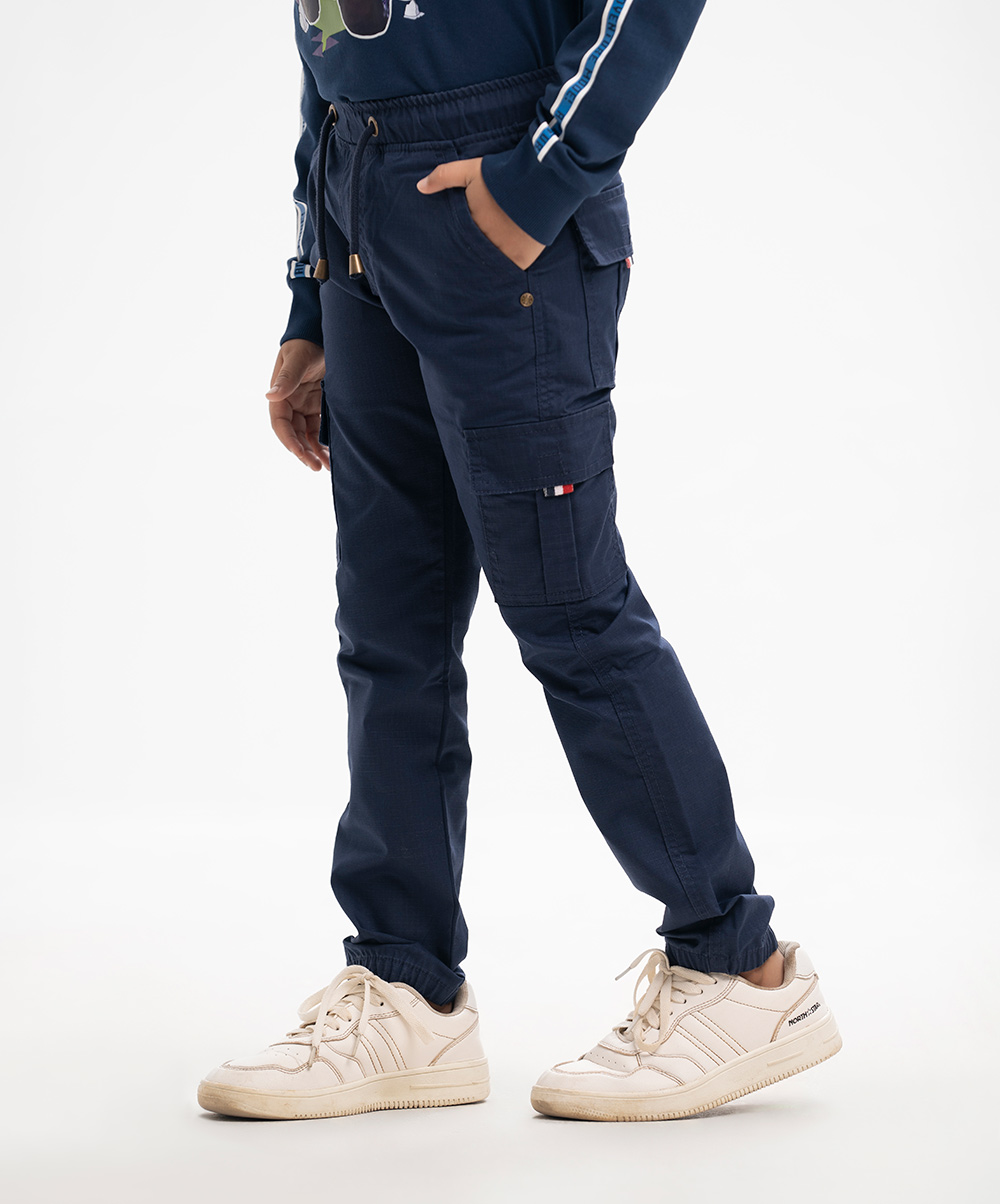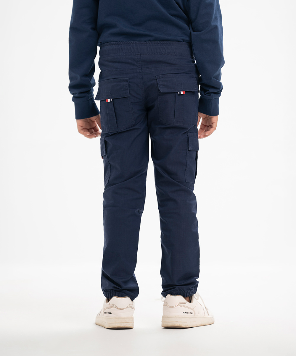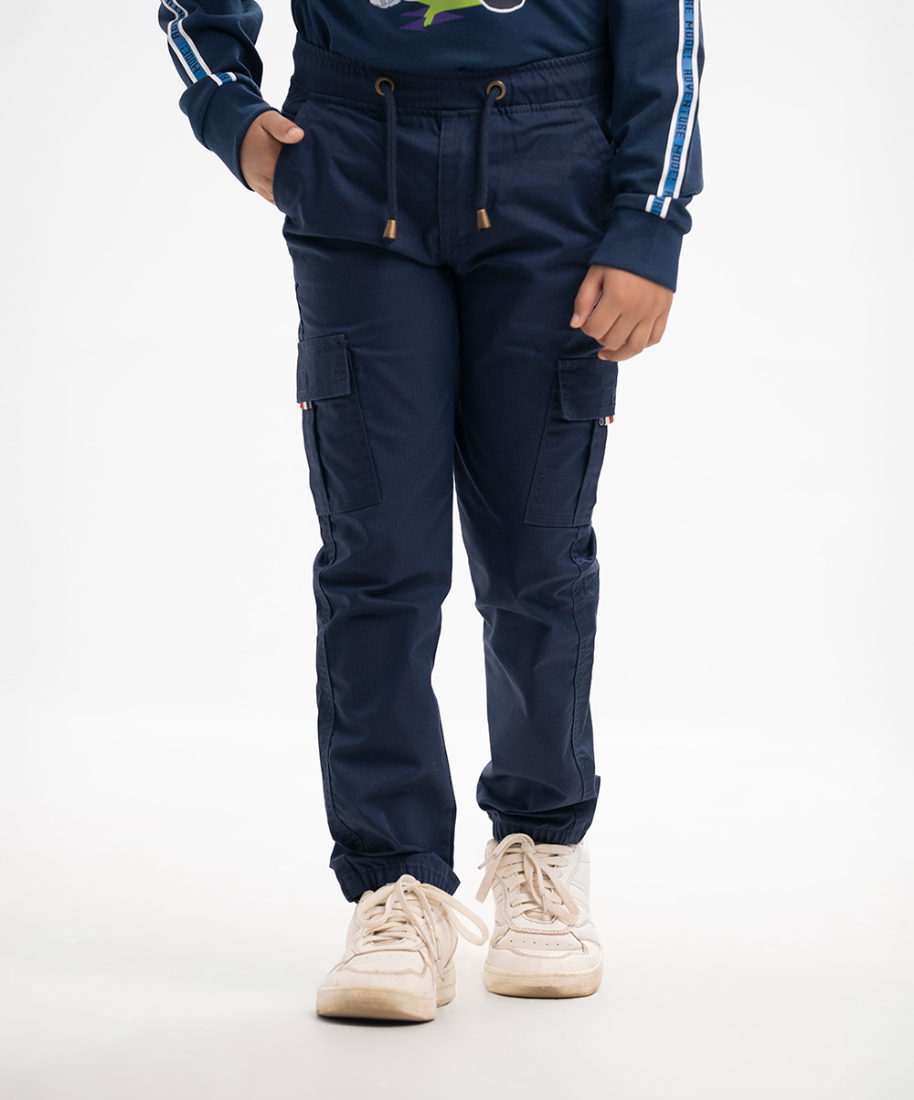 Kid boys long woven pants in twill fabric. Features two front cross pockets, two side cargo-style mobile pockets and two back pockets.