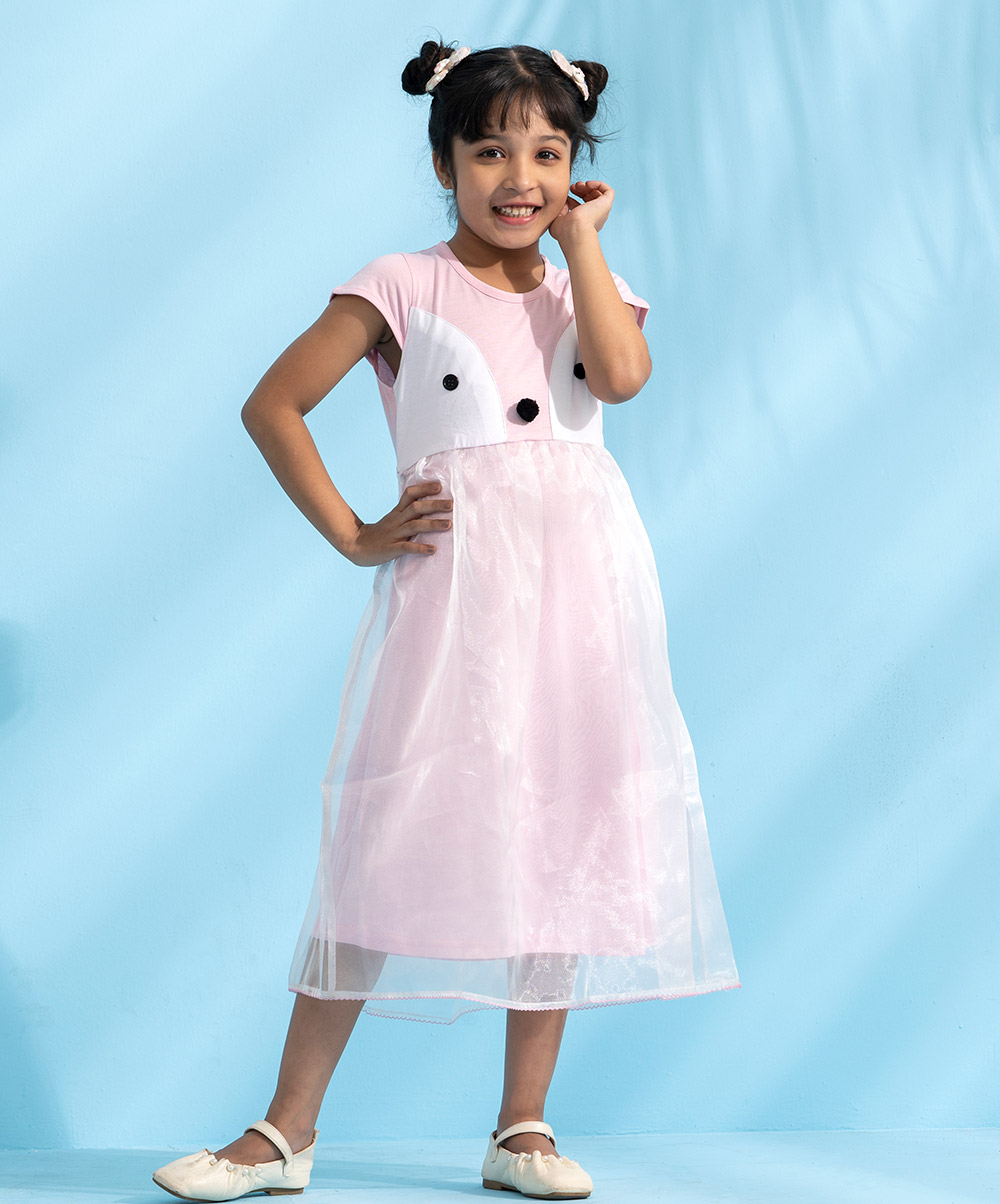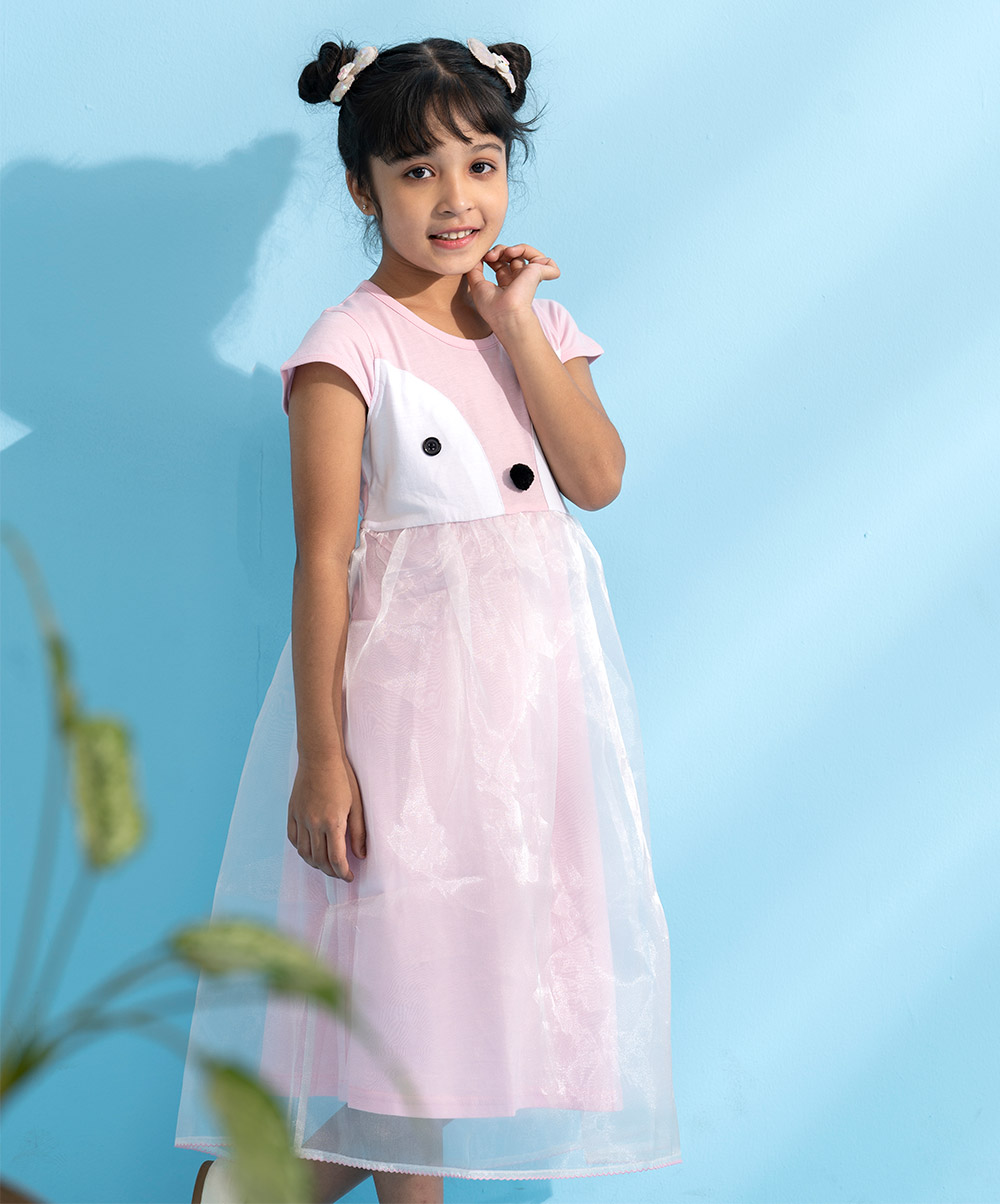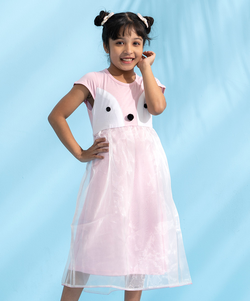 Pink penguin themed party frock crafted in cotton single jersey with a layer of organza. Embellished with front buttons, pompom and gathers on waistline.