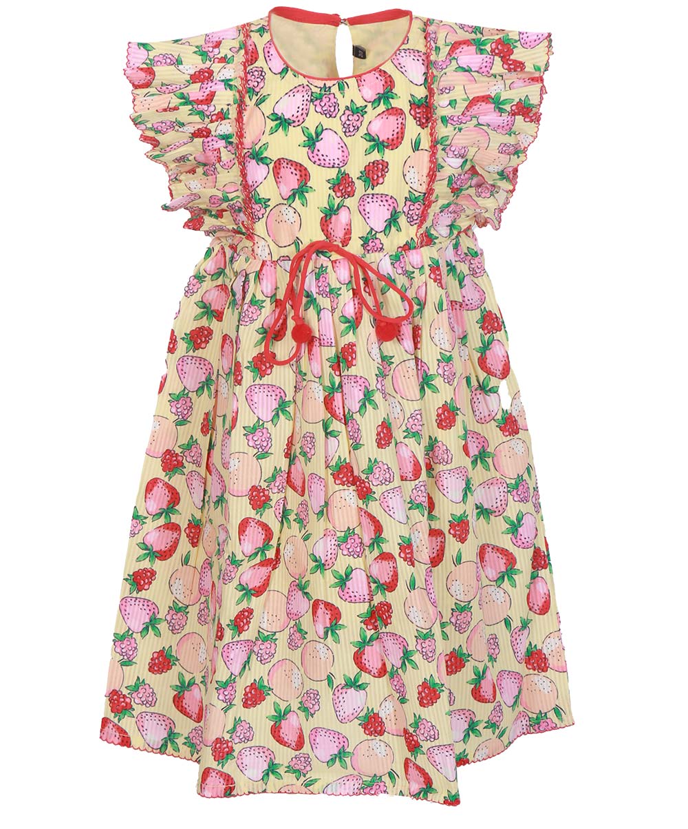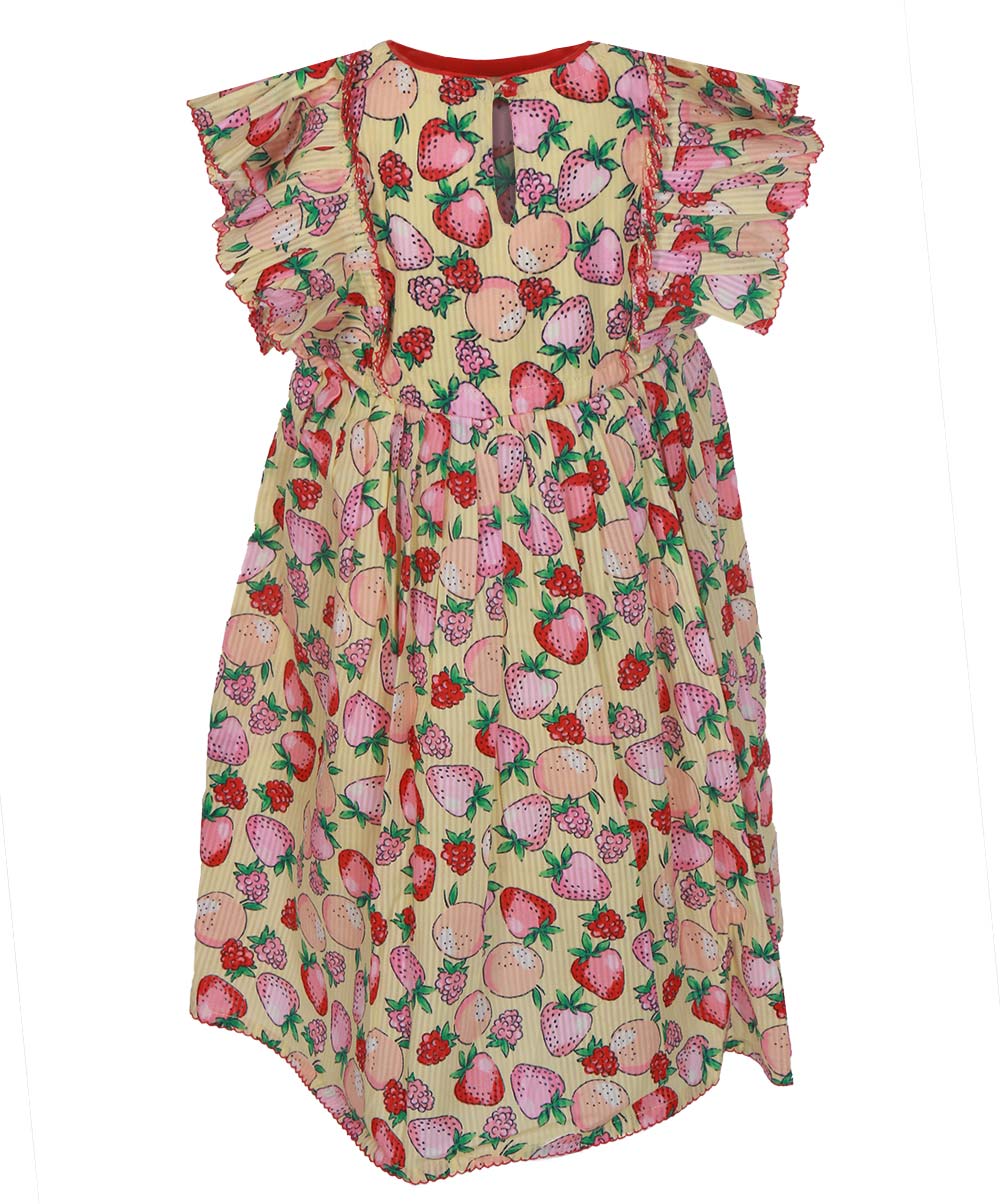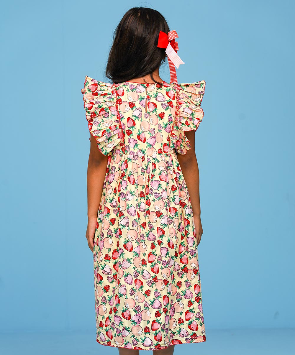 Yellow frock in printed cotton fabric, designed with frill sleeves. Embellished with drawstring attachment with pompoms.