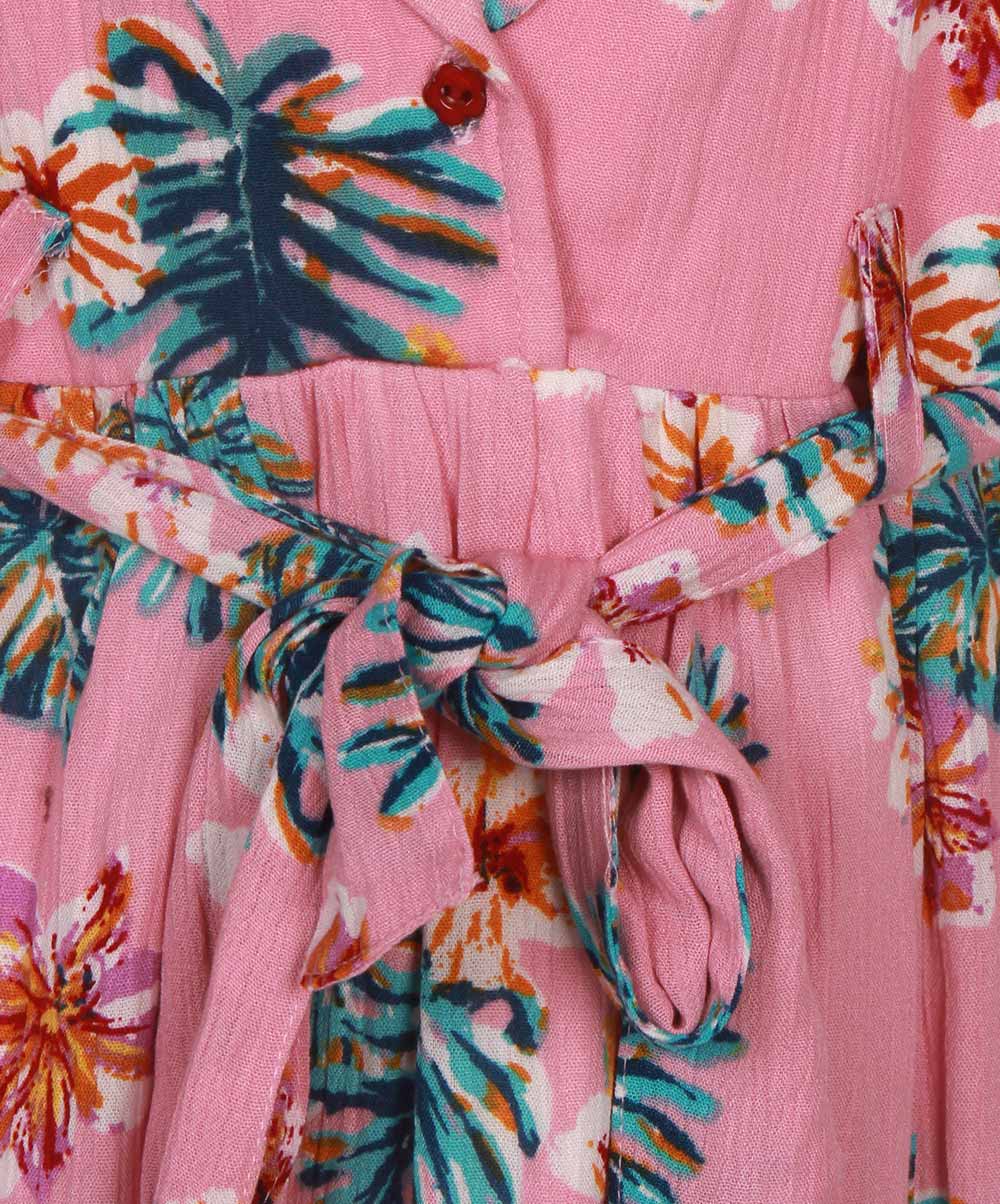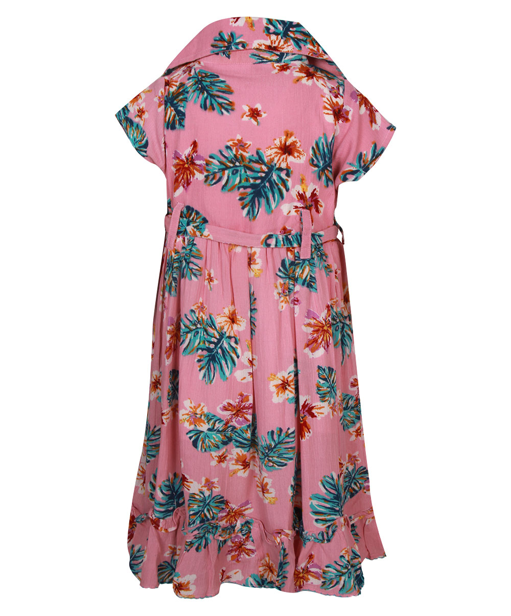 Pink printed crepe cotton frock with a tie belt and notch lapel collar. Embellished with gathered waistline and frills on hemline.