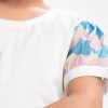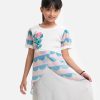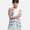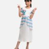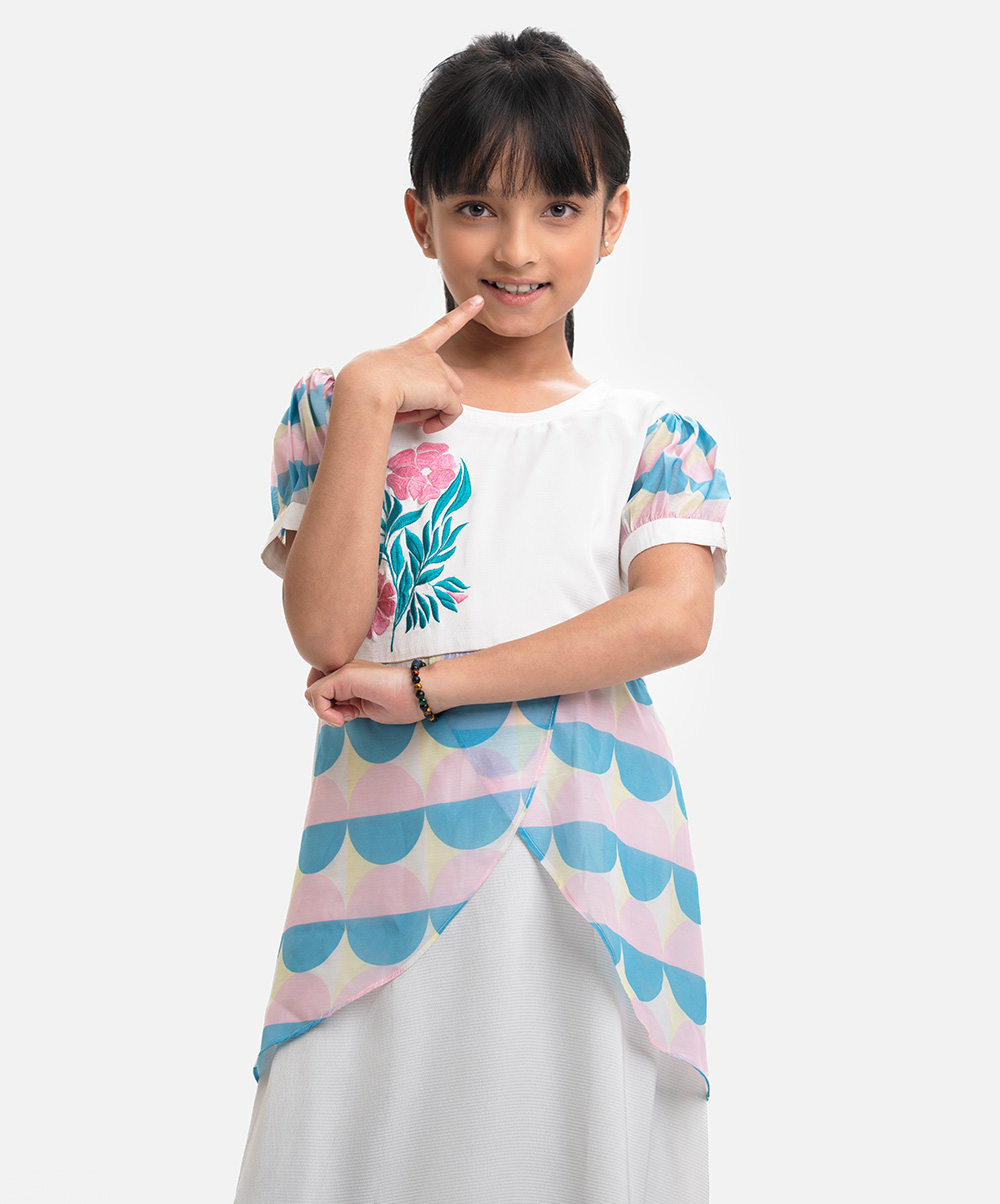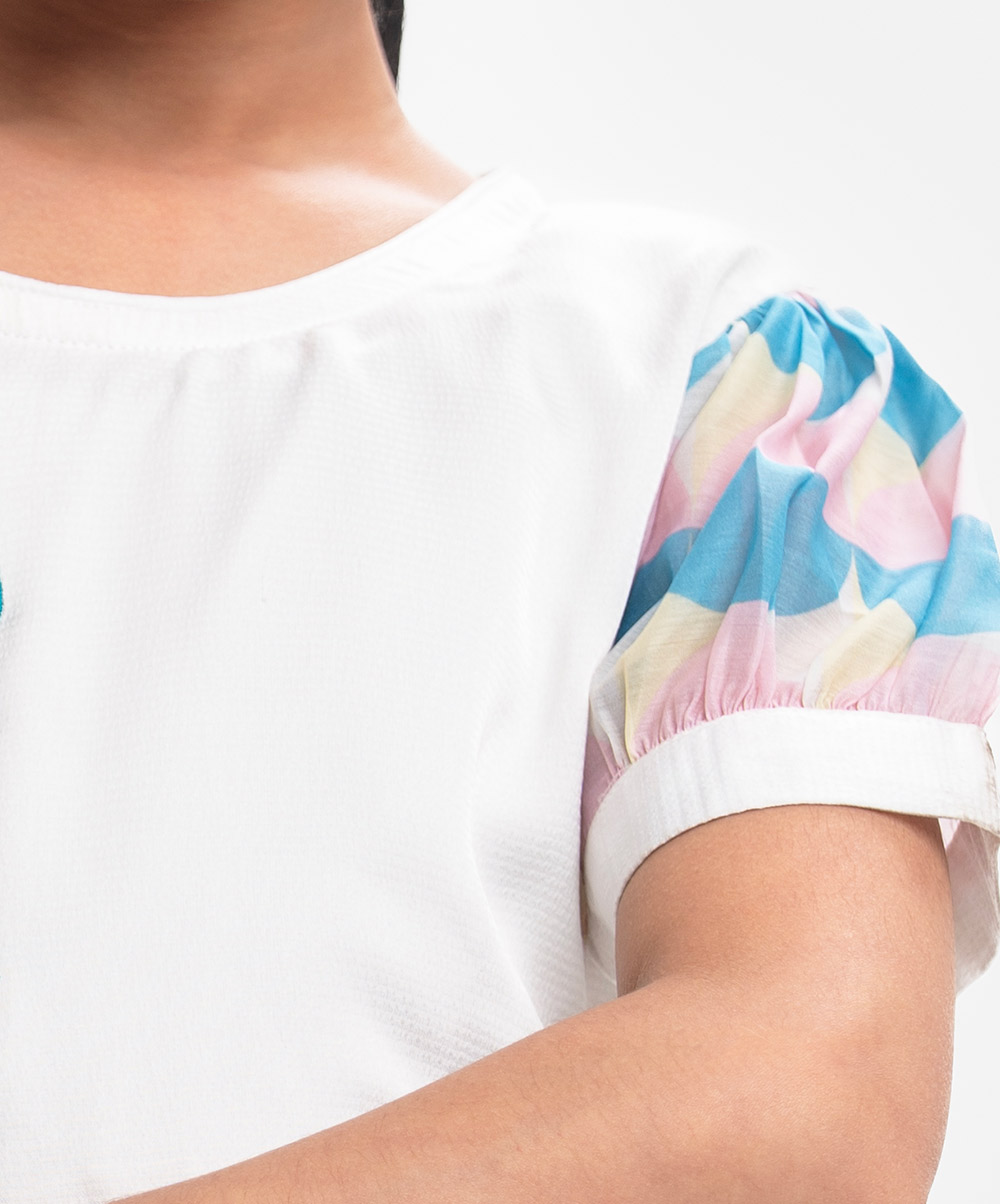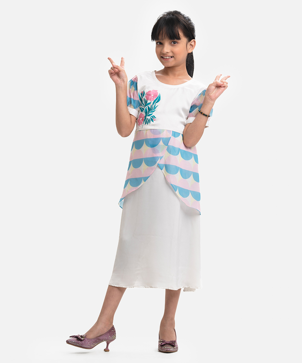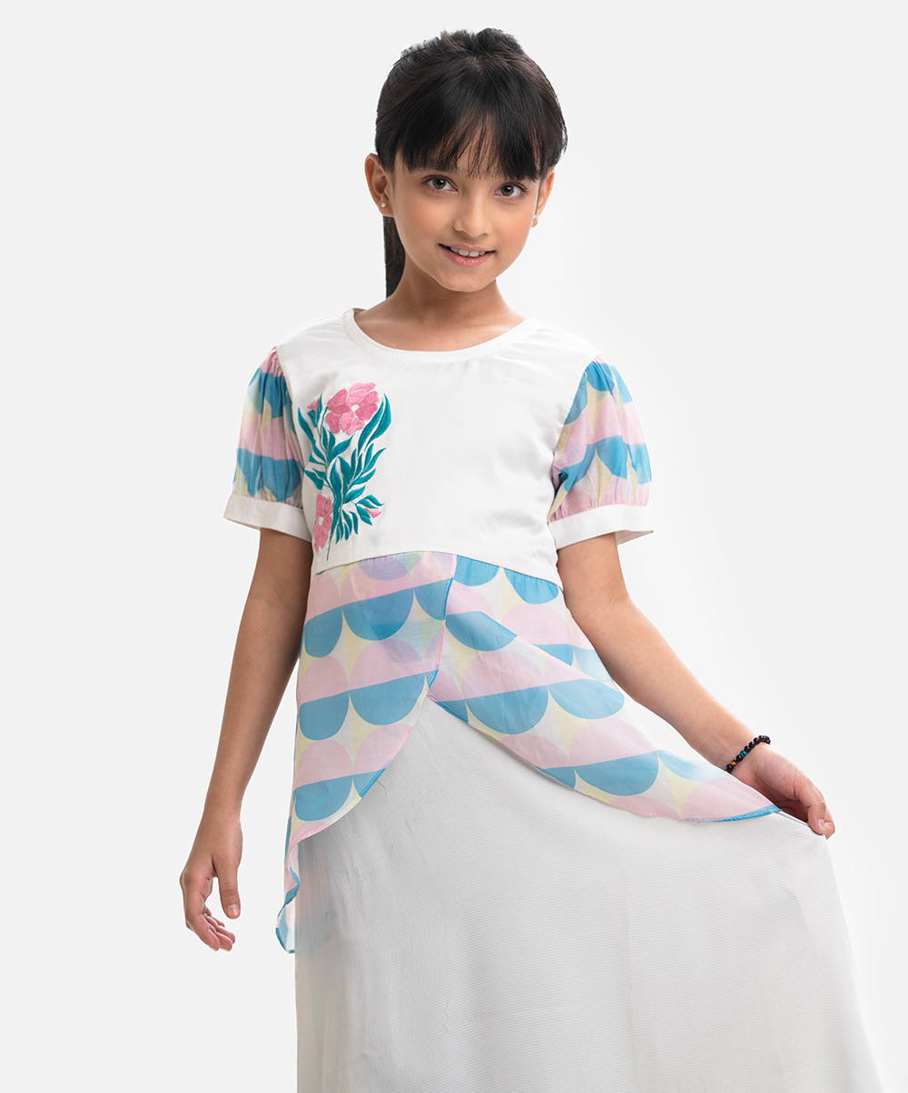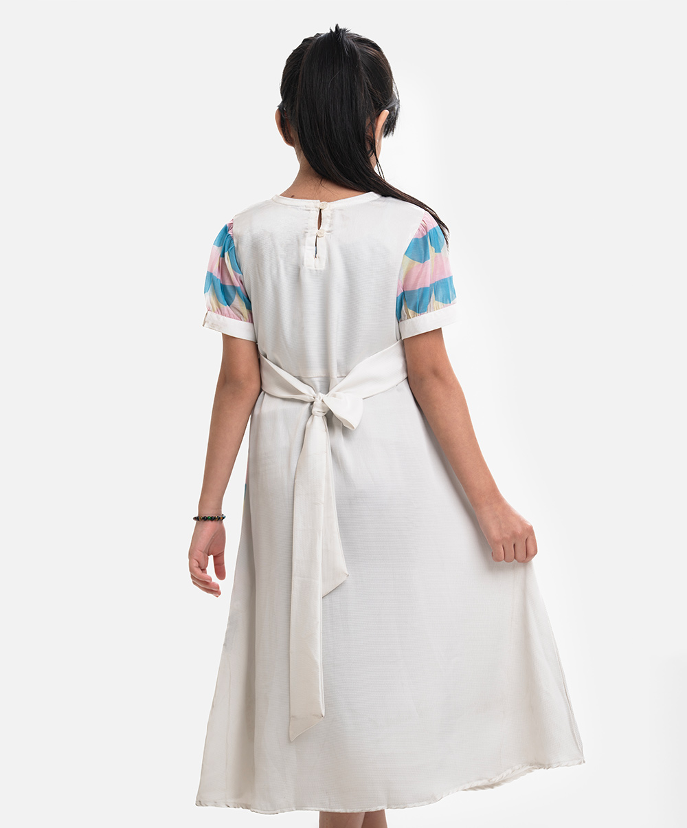 Round neck A-line frock in crepe fabric with organza petals at the front. Puff sleeves. Embroidery at the front.