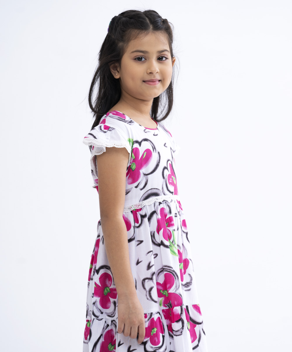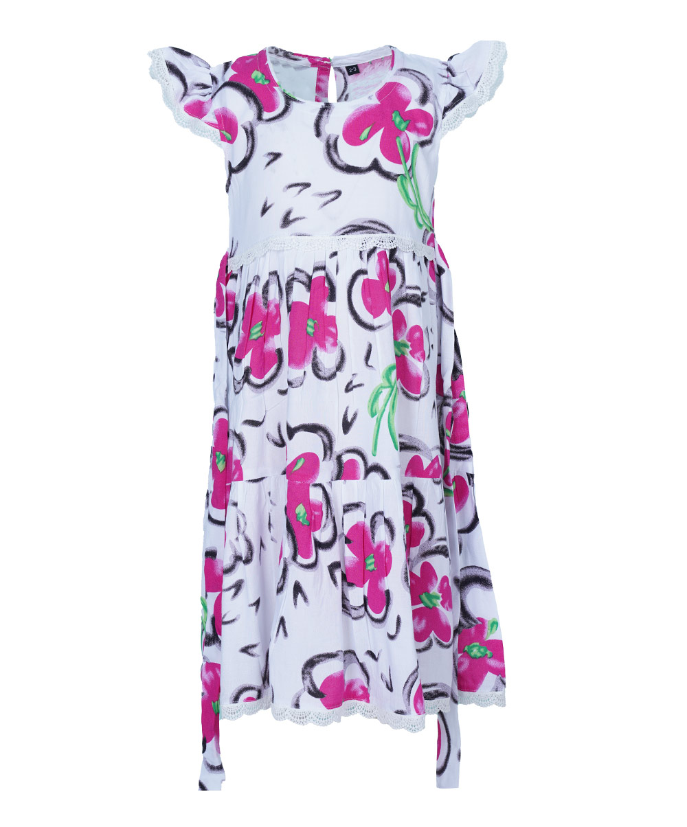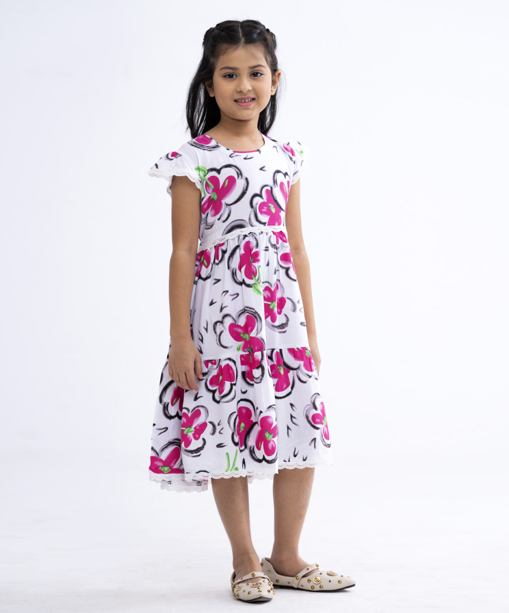 A-line frock with a round neck and cap sleeve, add frill from the hemline.