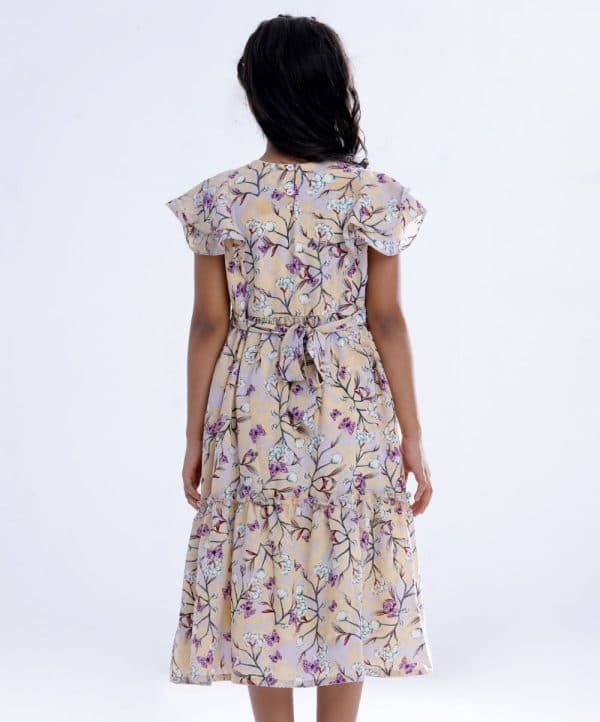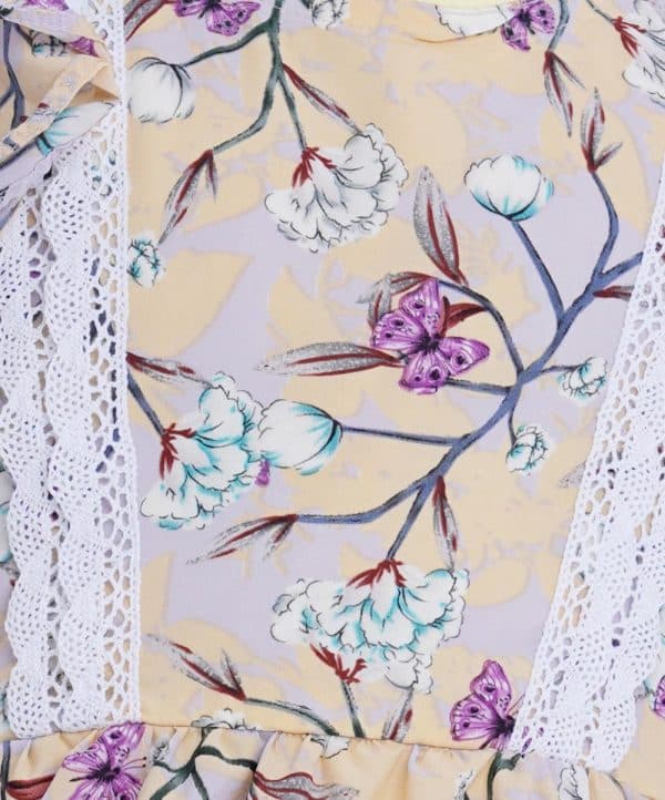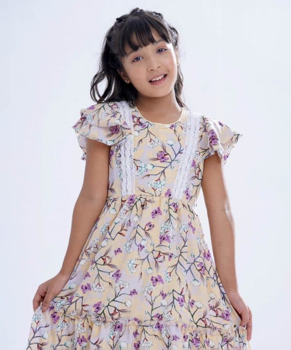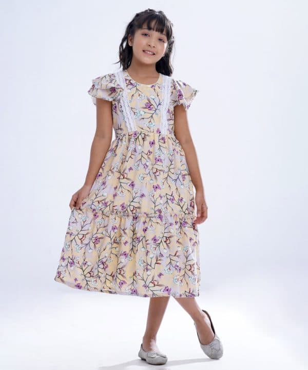 Yellow Frock in printed Georgette fabric. Designed with a round neck and butterfly sleeves. Detailed with lace attachment at the top front and gathers from the waistline. Viscose lining in full-body.
