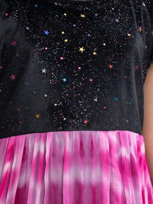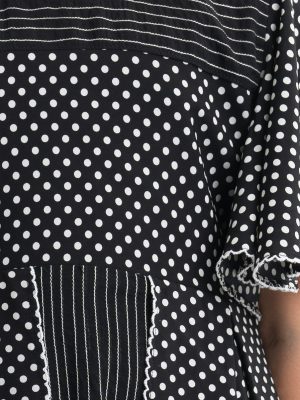 Black A-line Frock in Crepe fabric. Designed with a round neck and butterfly sleeves. Embellished with embroidery at the front. Detailed with extended ruffles around the waistline. Viscose lining in half-body. Zipper closure at the back.