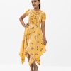 Kid girls handkerchief style frock in printed Georgette fabric. Puffed sleeves, gathered and lace work at front. Waist tie belts and viscose inner in half-body.