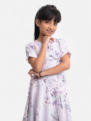 Kid girls frock in floral printed georgette fabric with half-body viscose inner. Lantern sleeved, peter pan collar and elongated hem. Lace work at front with tie-cord waist belt.