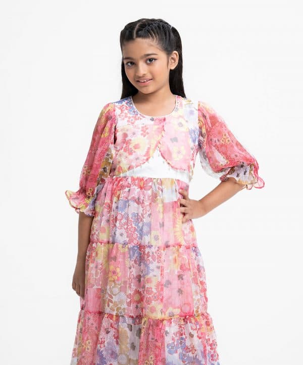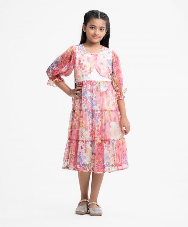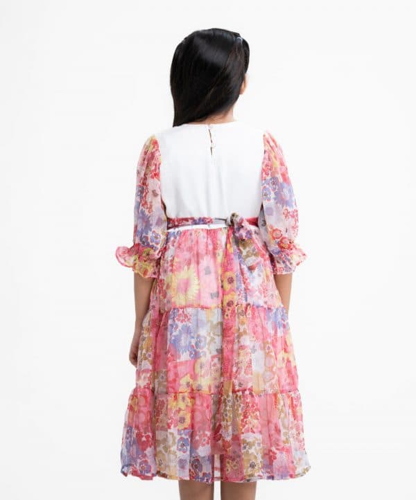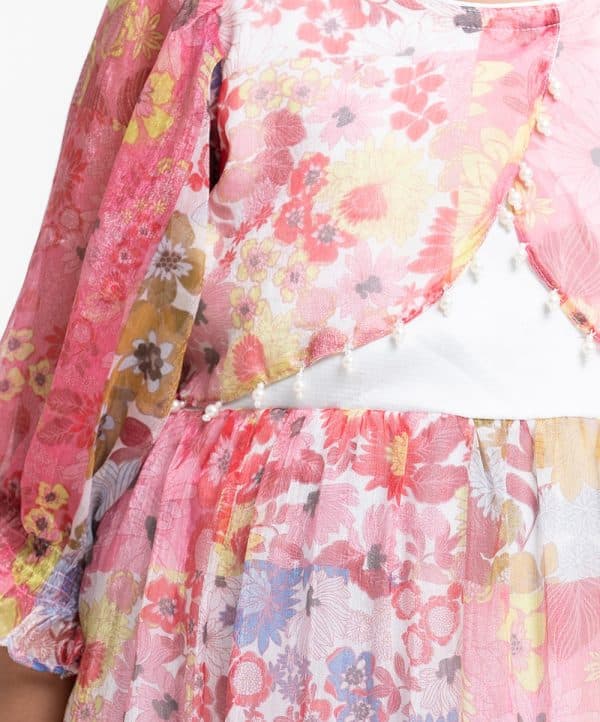 Kid girls A-line frock in printed georgette fabric with viscose lining. Bishop sleeves, round neck, patchwork with beads attached at front and tie-cord at back.