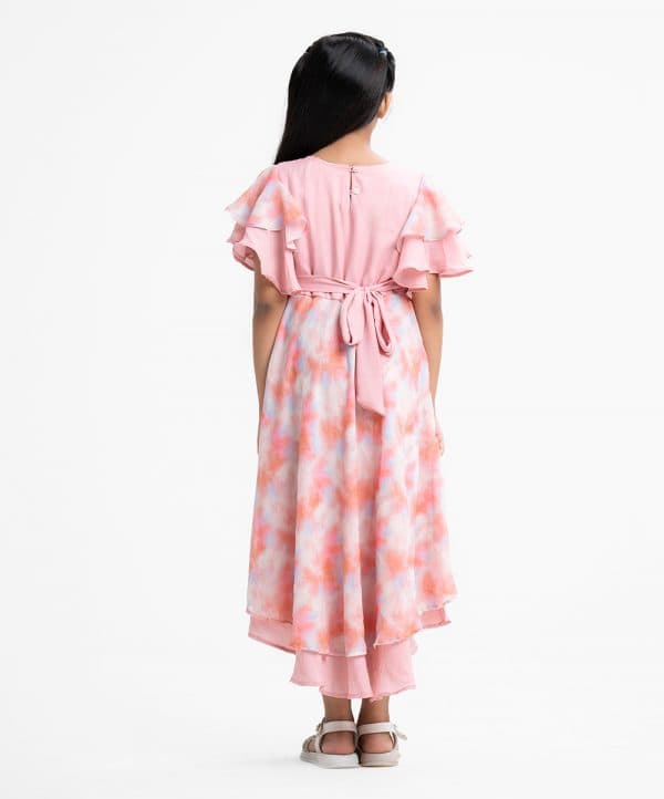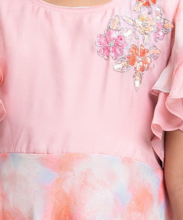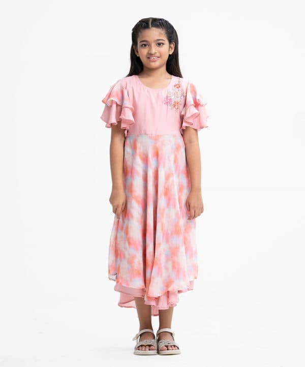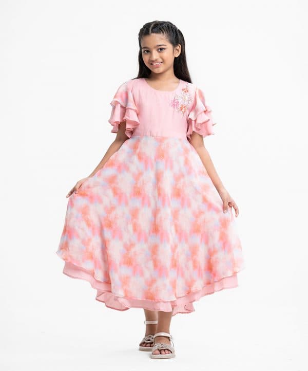 Kid girls’ A-line frock in georgette fabric. Round neck, butterfly sleeves. Patchwork from the waistline & sleeves and karchupi on the chest.