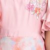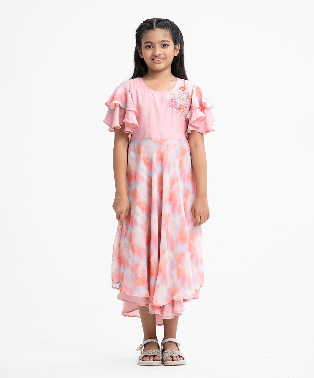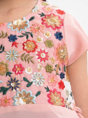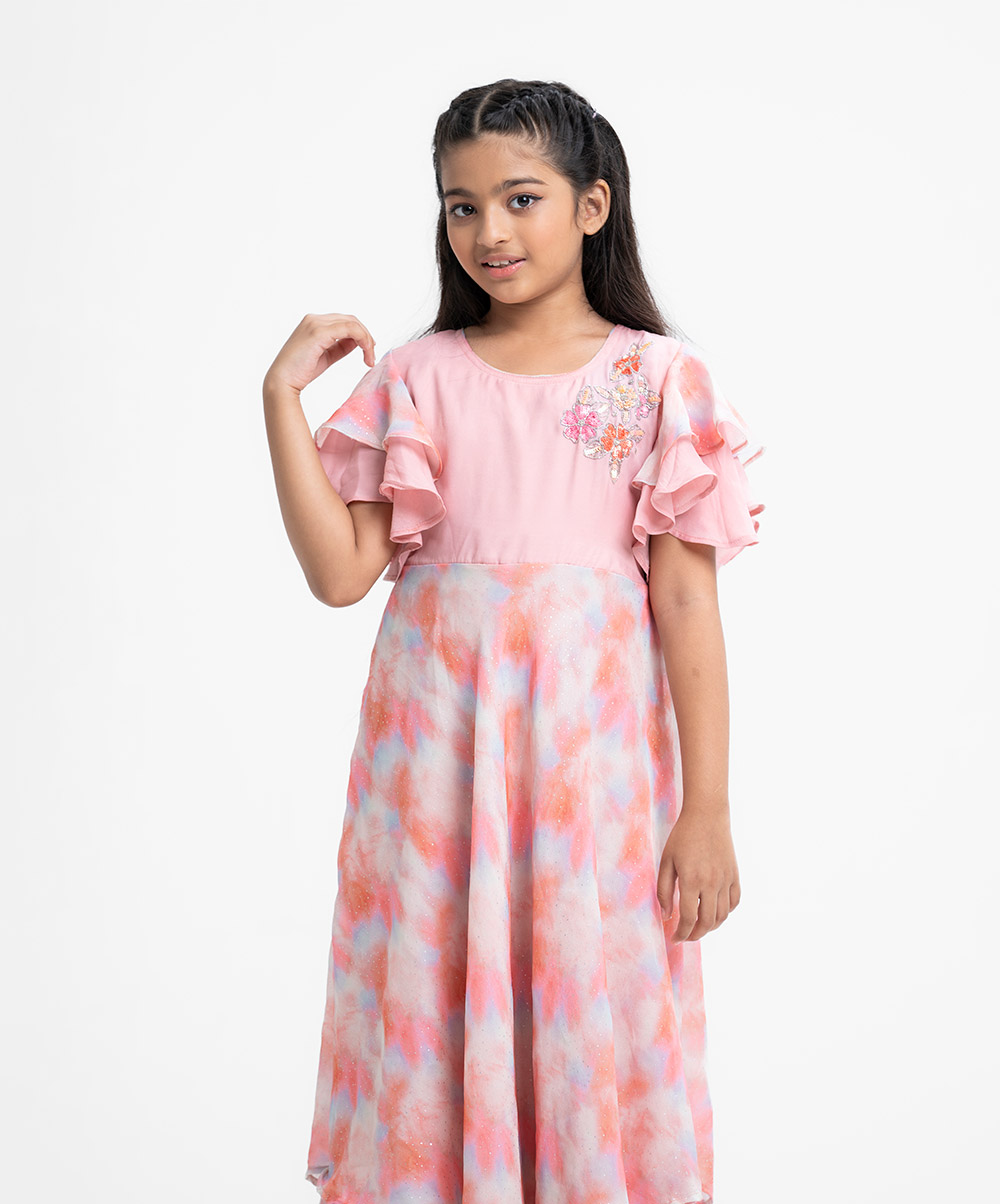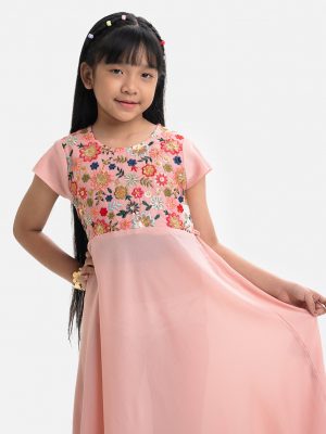 Kid girls’ A-line frock in georgette fabric. Round neck, butterfly sleeves. Patchwork from the waistline & sleeves and karchupi on the chest.