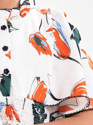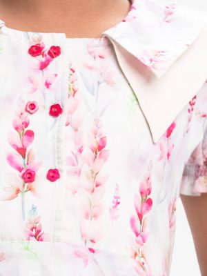 Kid girls printed A-line frock in cotton fabric. Cap sleeves, round neck. Tie-cord and box pleated from the waistline.