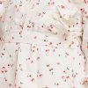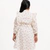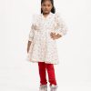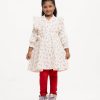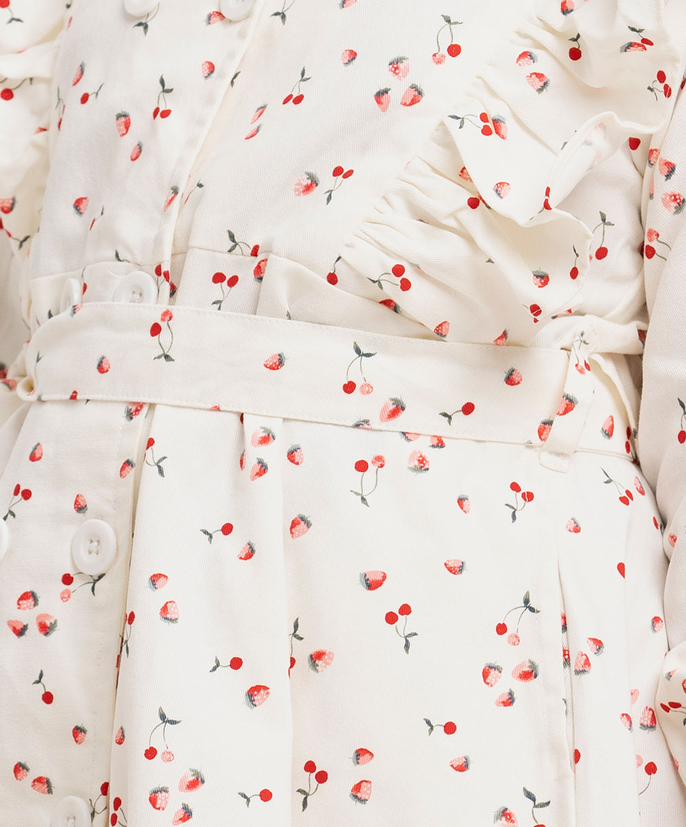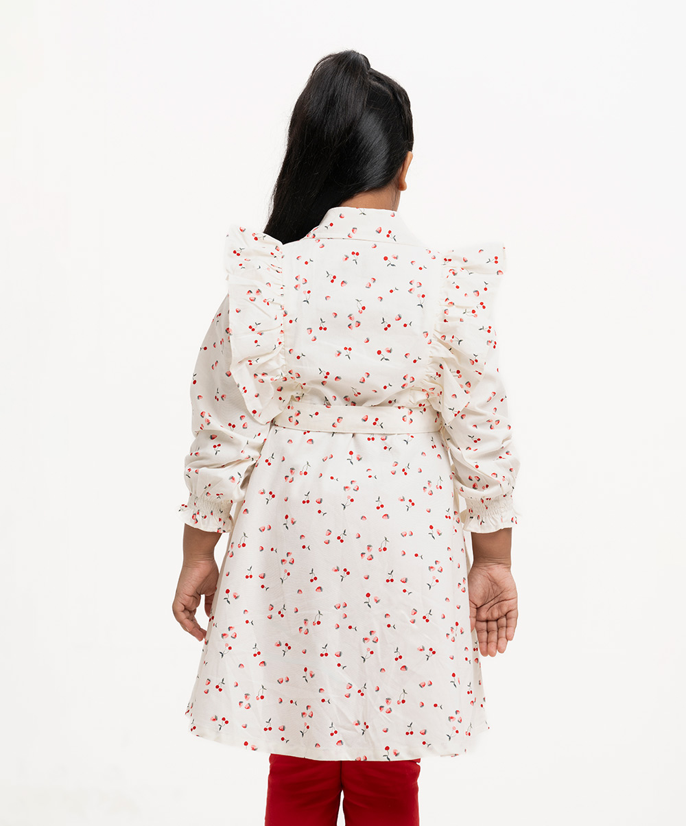 Kid girls frock in printed twill fabric. Full sleeves, lapel collar. Buttons fastening, ruffle at front and waist belt.