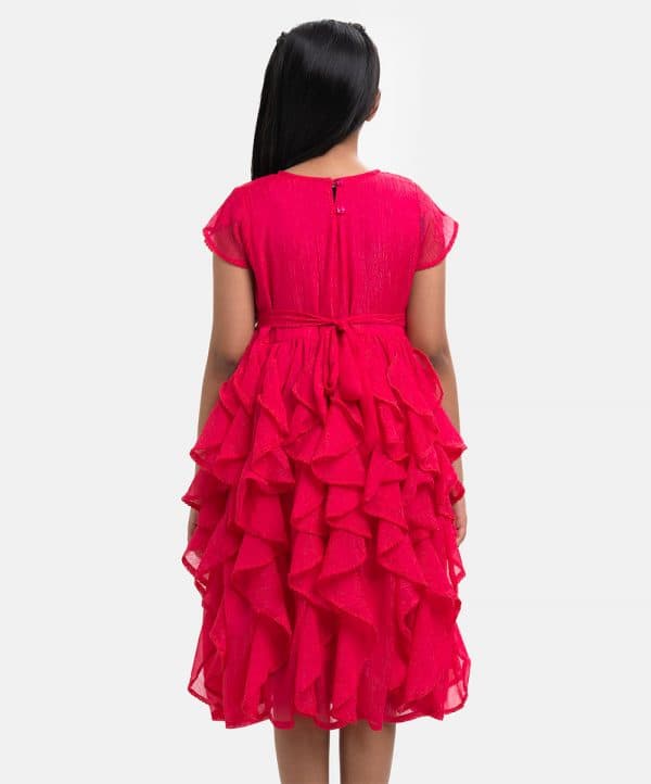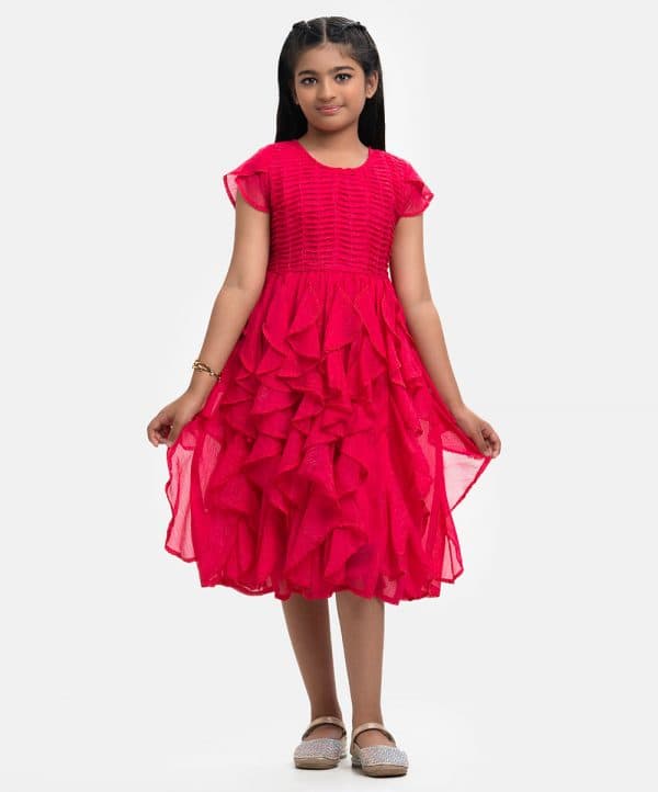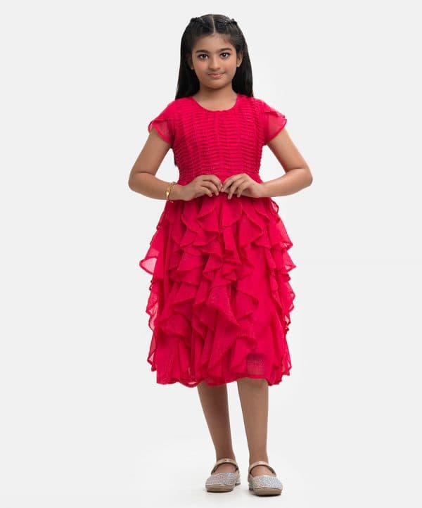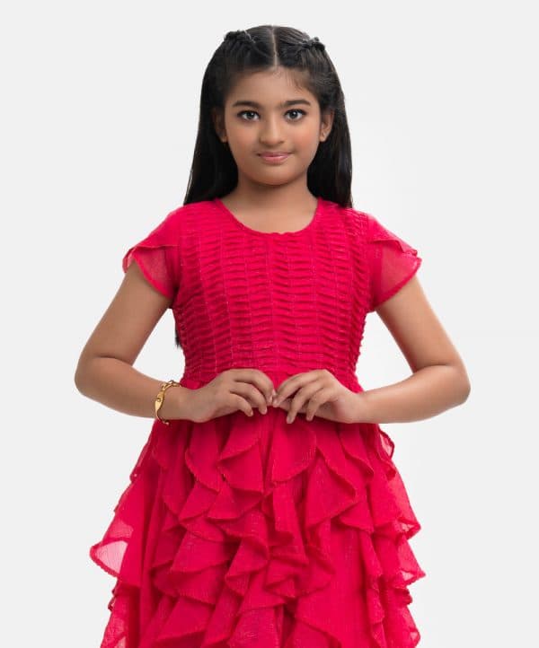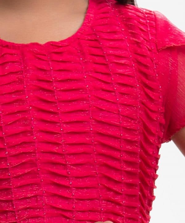 Round neck party frock in georgette fabric. Petal sleeves, wave pintuck with beads at the top front. Ruffle details from the waistline. Full cotton lining inside.