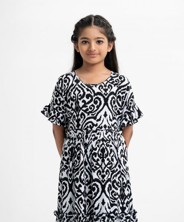 Kid girls’ printed flared style frock in viscose fabric.Round neck, short-sleeved. Gathered at the waistline with a belt.