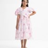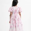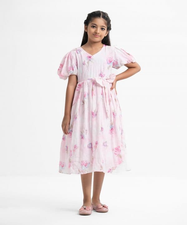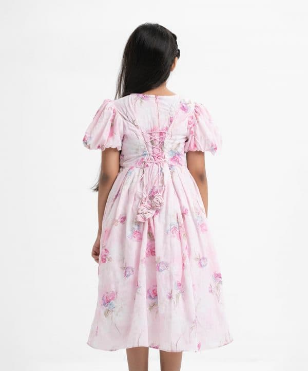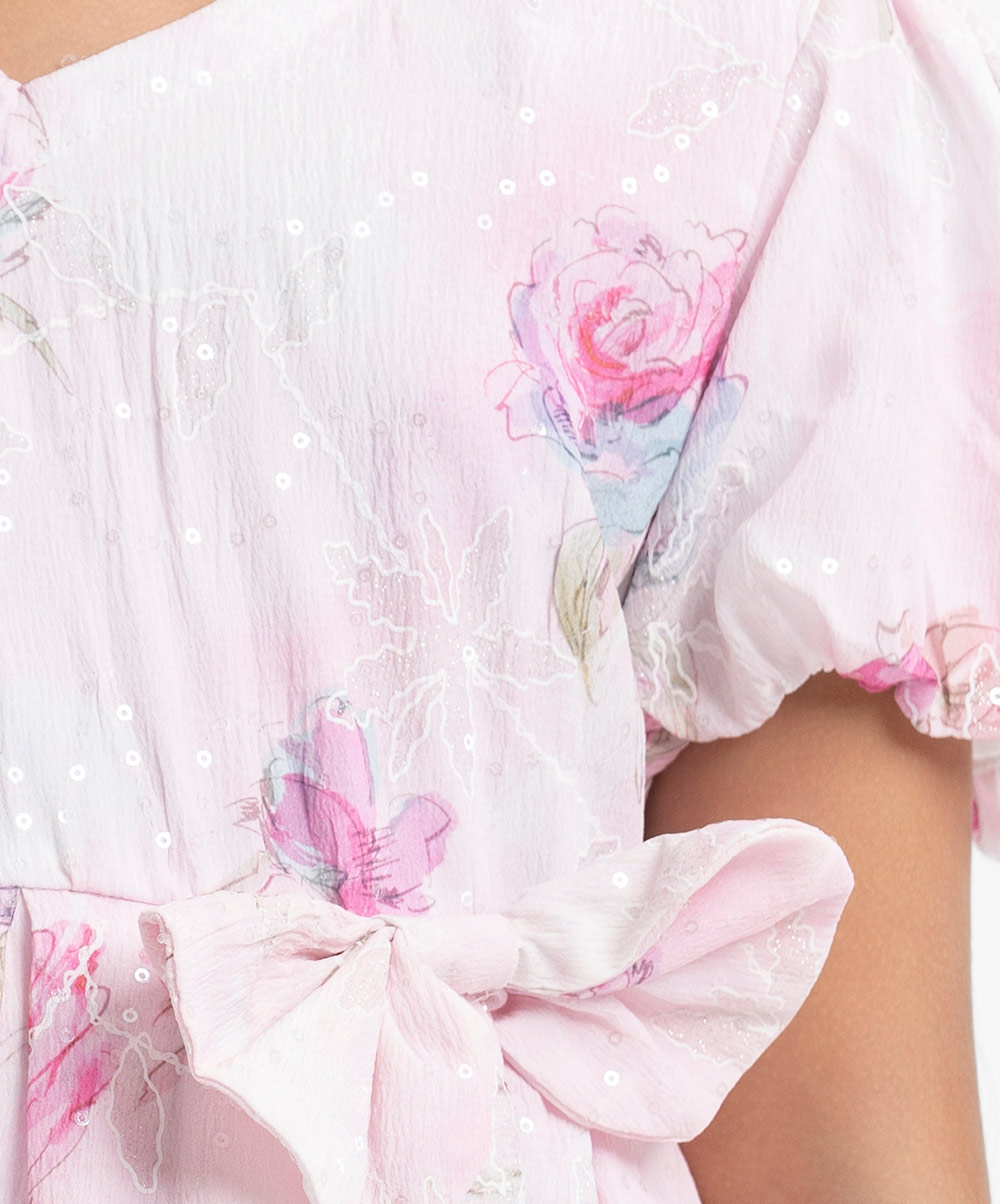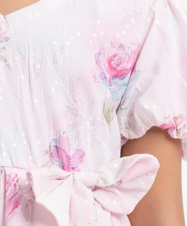 Kid girls fairy tale frock in floral printed georgette sequins fabric with full cotton lining and cancan inner. Balloon sleeves, heart neckline. Bow attached and box pleated at waistline. Zipper closing and criss-cross tie-up back with floral tassels.