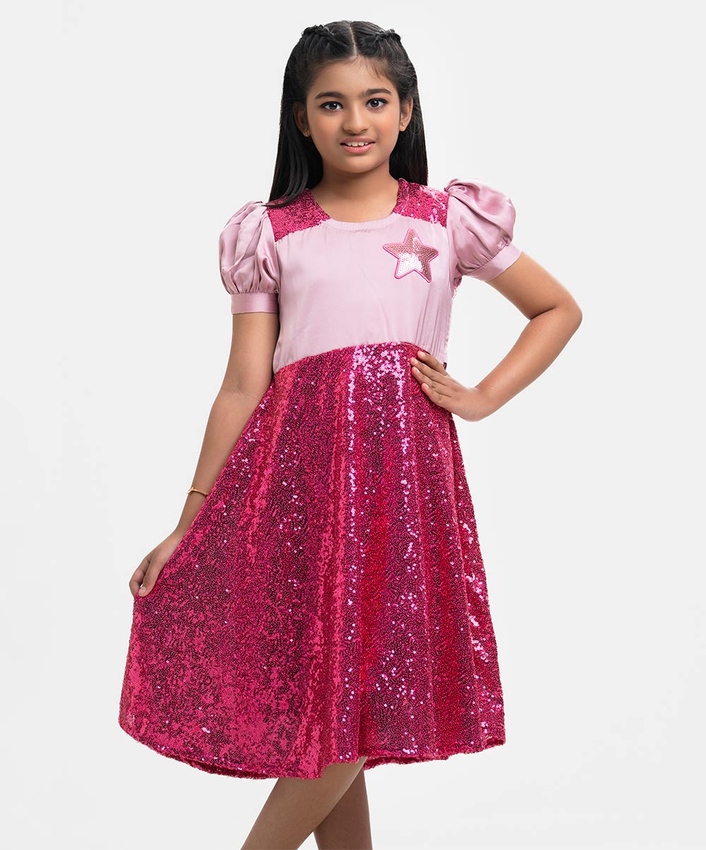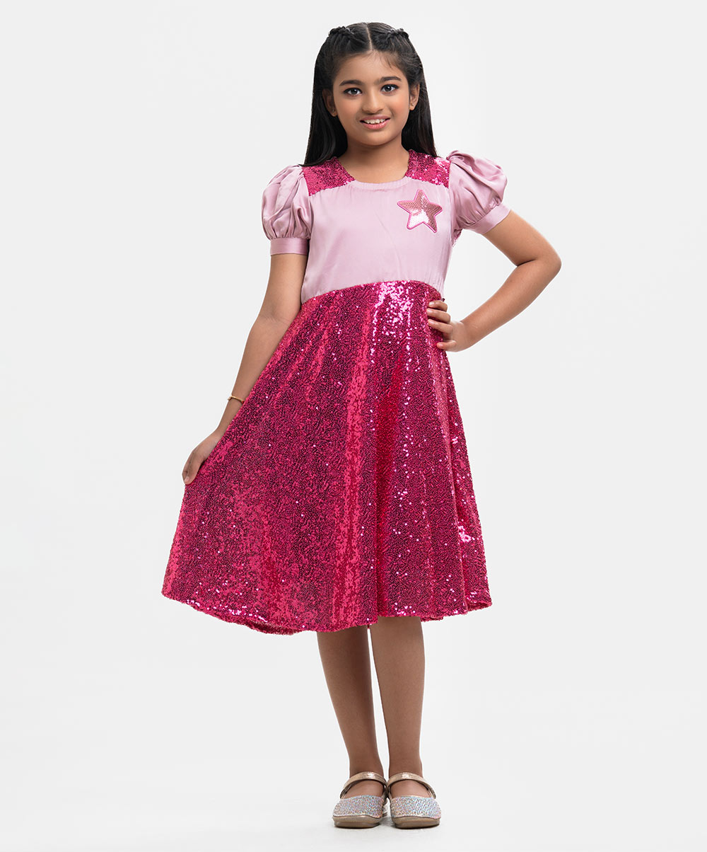 Round neck A-line frock in sequined georgette fabric. Puff sleeves, full viscose lining.