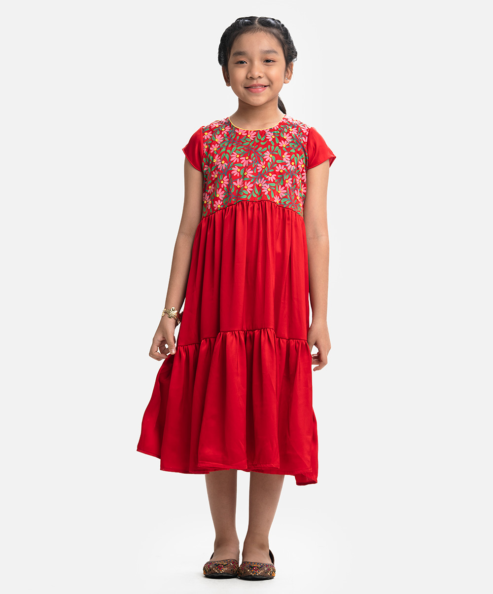 Round neck A-line frock in satin-georgette fabric. Cap sleeves, embroidery at the front. Flared hemline.