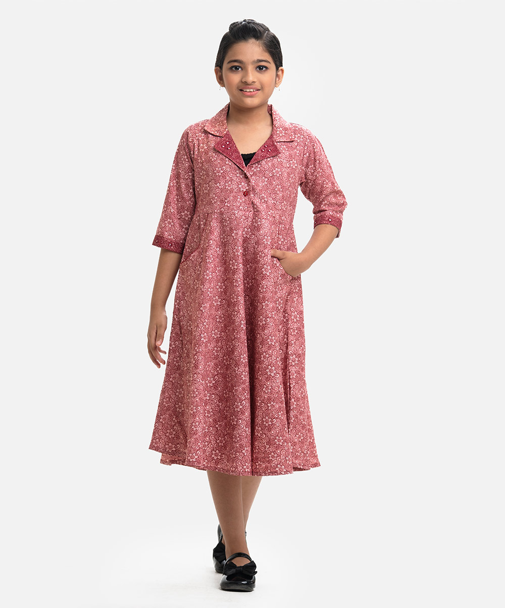 Lapel collar A-line frock in blended fabric. Three-quarter sleeves with embroidery on the collar and cuffs. Cross-pockets on the sides.