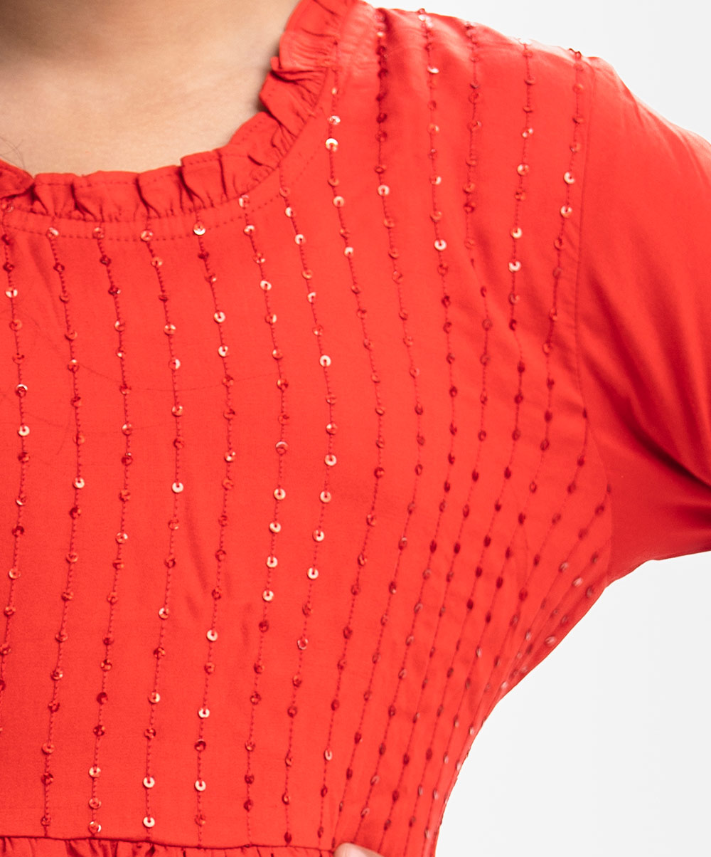 Frilled round neck A-line frock in viscose fabric. Sequins at the top front. Lantern sleeves.