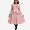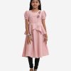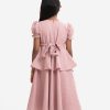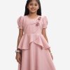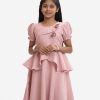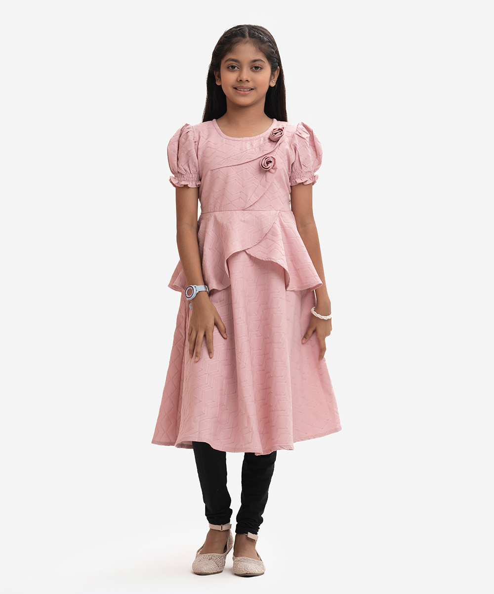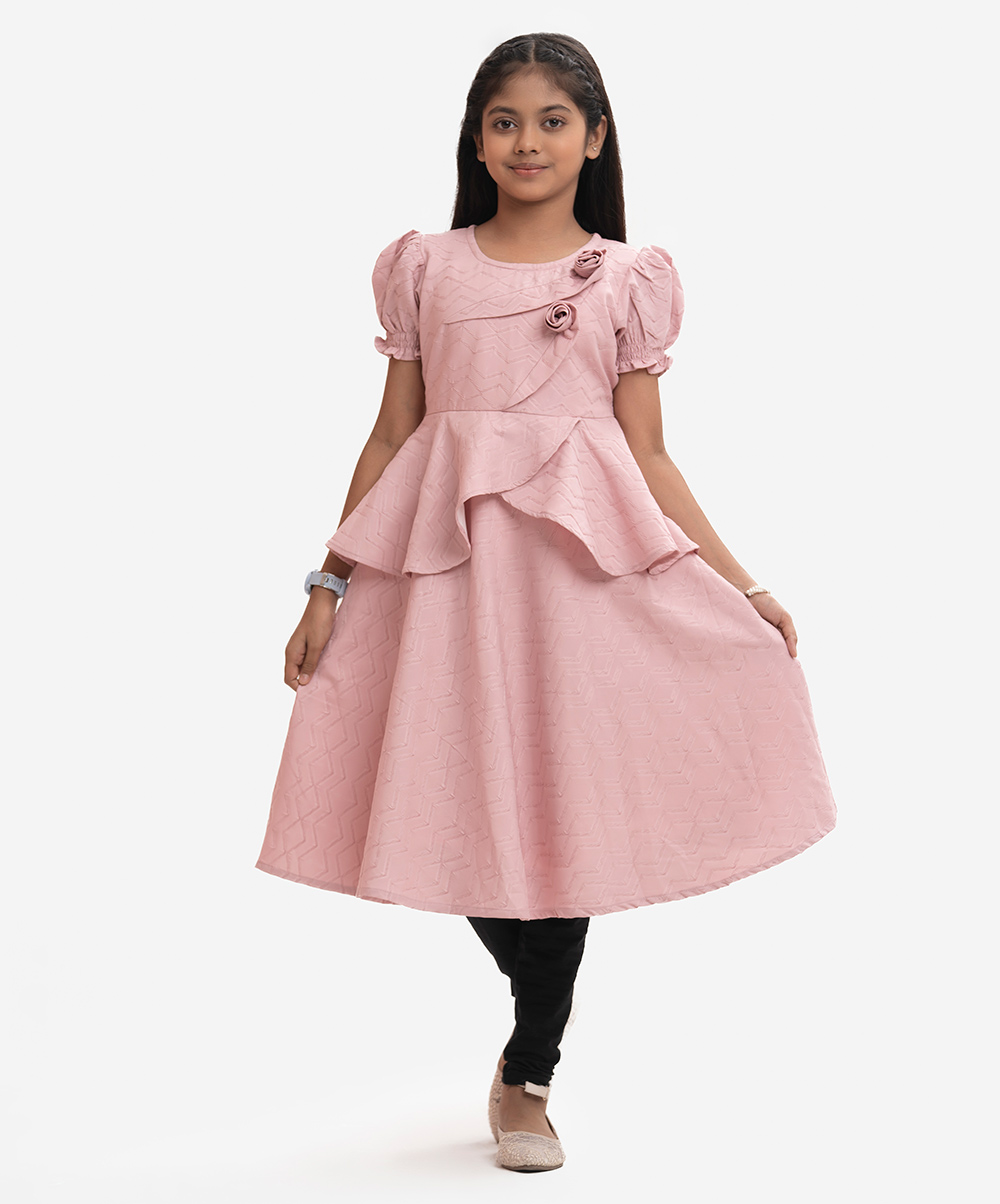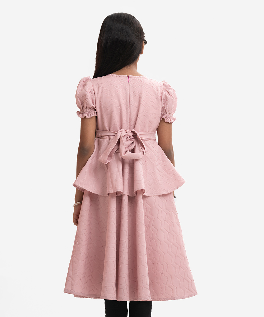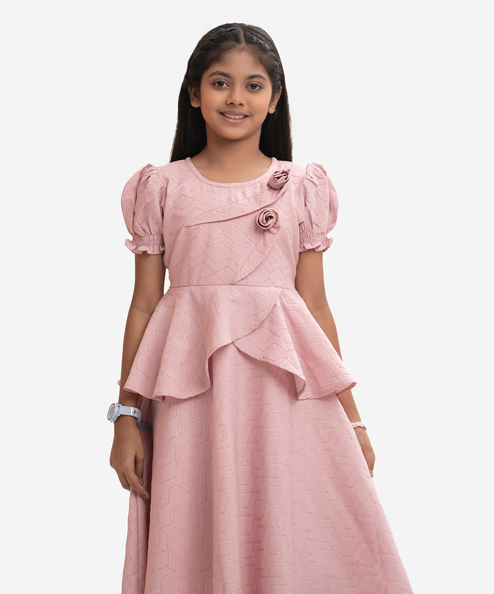 Kid girls frock in textured georgette fabric. Puff sleeves, round neck. Peplum & rose detail at front and a tie-cord waist belt.