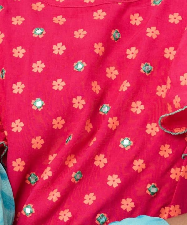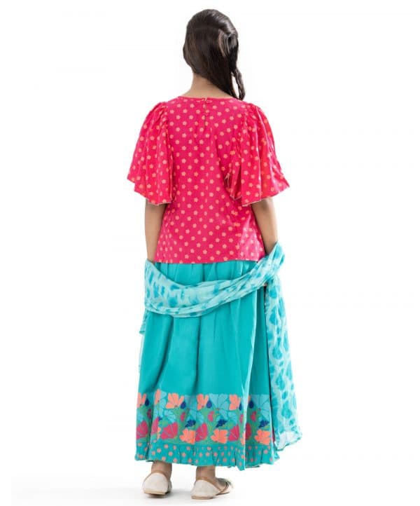 Magenta and Turquoise all-over printed Ghagra-choli set in Viscose fabric. The top is designed with a round neck and butterfly sleeves. Embellished embroidery at the top front. Button opening at the back. Paired with the gathered skirt with a concealed elasticated waistline. Spliced gather hemline. Complemented with tie-dye chiffon dupatta.