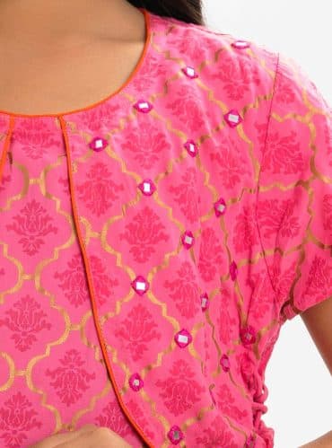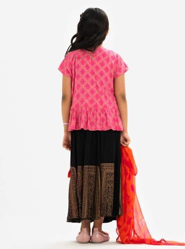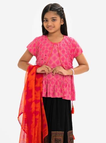 Magenta and Turquoise all-over printed Ghagra-choli set in Viscose fabric. The top is designed with a round neck and butterfly sleeves. Embellished embroidery at the top front. Button opening at the back. Paired with the gathered skirt with a concealed elasticated waistline. Spliced gather hemline. Complemented with tie-dye chiffon dupatta.