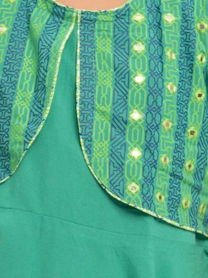 Kid girls printed ghagra choli set in crepe fabric. Butterfly sleeved top with karchupi at front. Tie-dye chiffon dupatta with ethnic printed skirt.