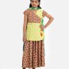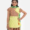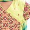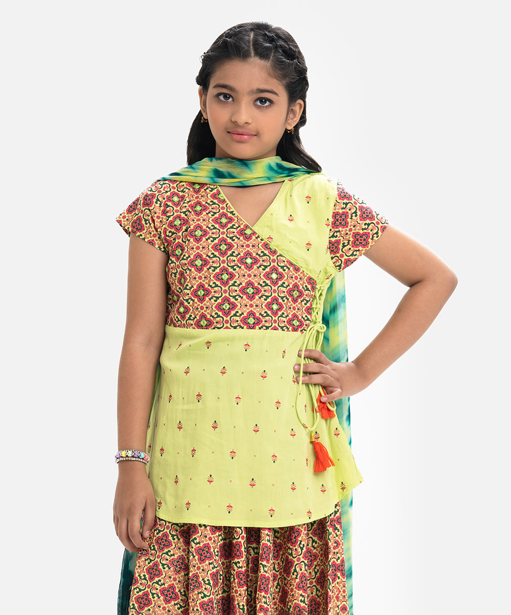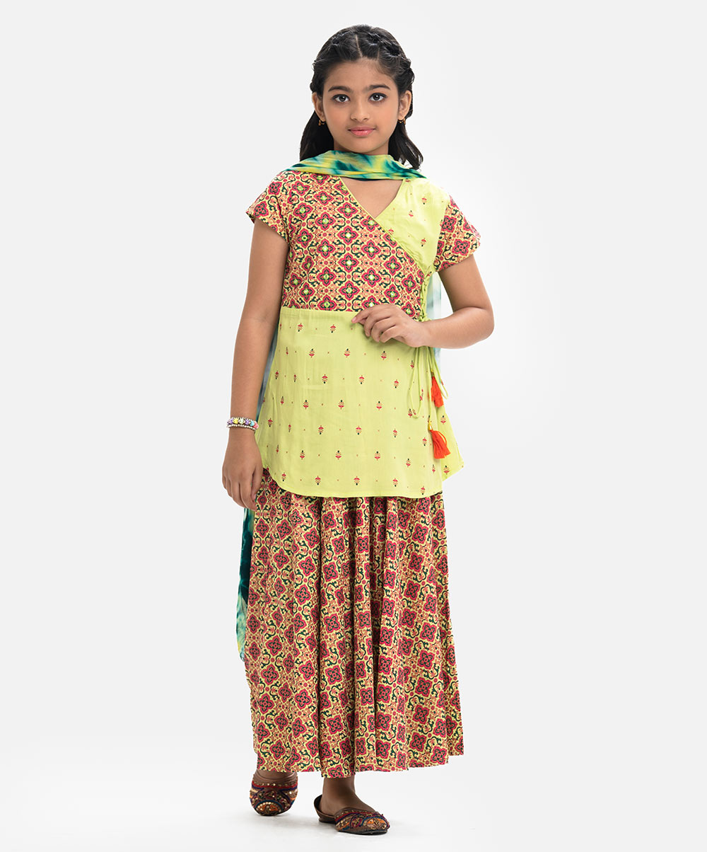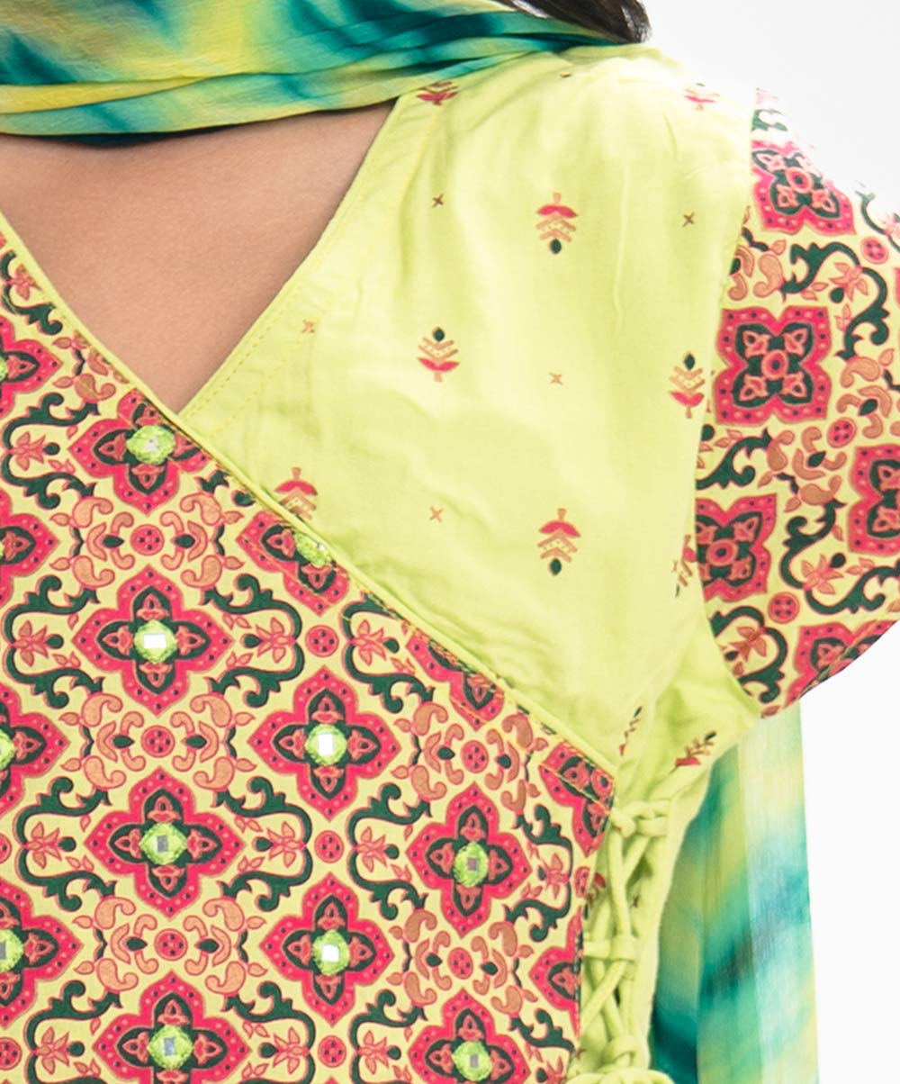 Retr wrap style gragra choli set in viscose fabric. Embroidery at the front. Complemented with a skirt and a matching dupatta.