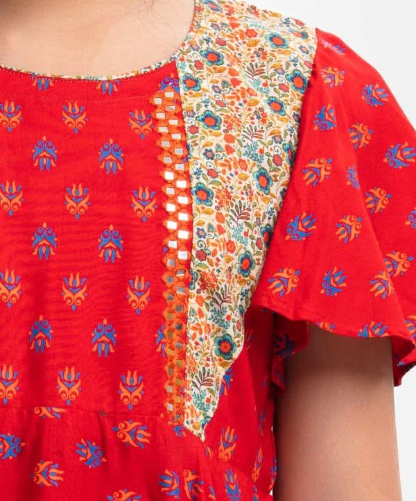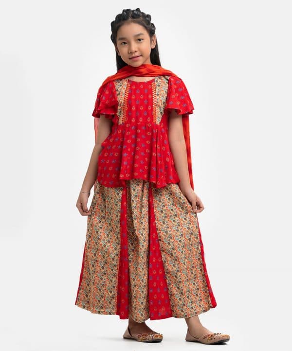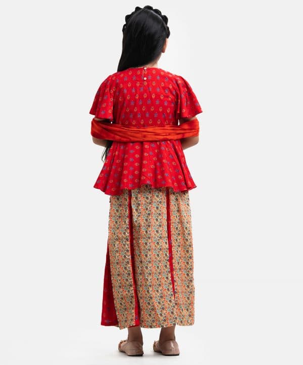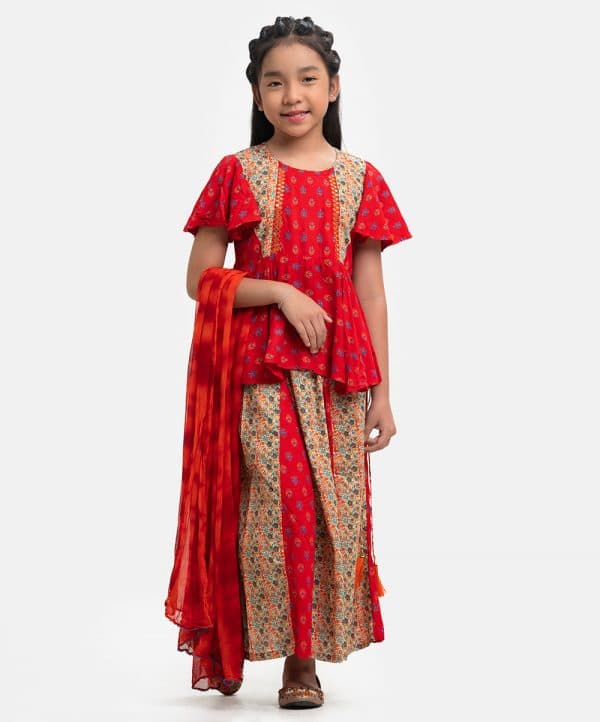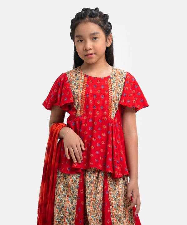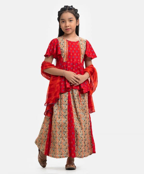 Round-neck ghagra-choli set in viscose fabric. Butterfly-sleeved peplum top with embroidery at the front. Complemented with a godet skirt and a tie-dye chiffon dupatta.